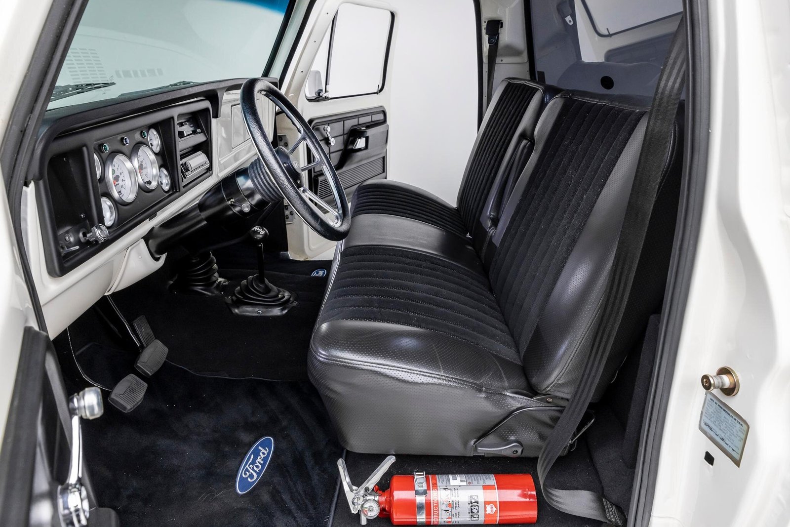 The standard cab features a bench seat reupholstered in black leather joined by a matching dash top, carpets, and door panels.