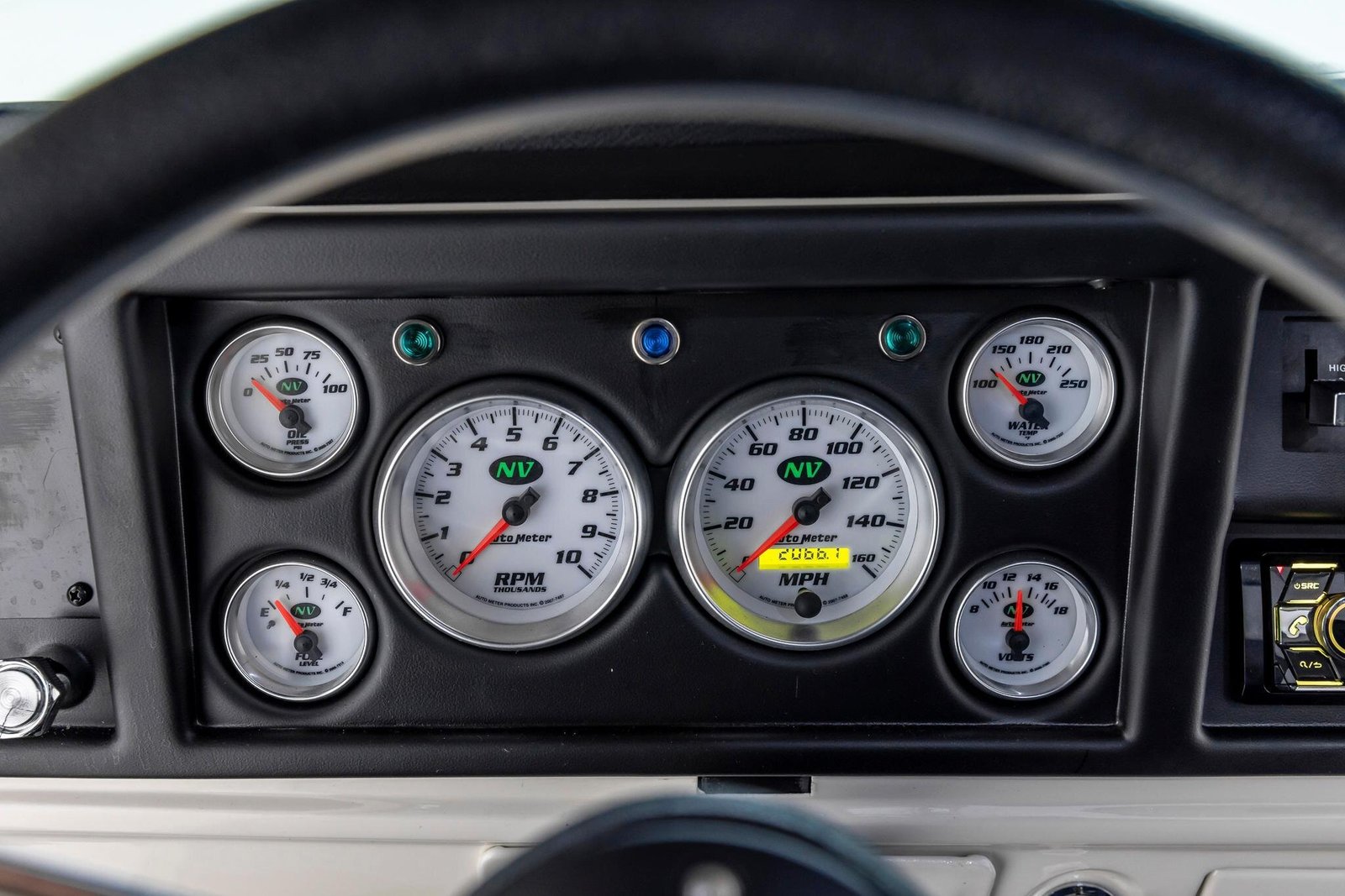 The multi-spoke steering wheel fronts green-backlit AutoMeter NV gauges including a 160-mph GPS speedometer, a 10k-rpm tachometer, and auxiliary readouts for fuel level, coolant temperature, oil pressure, and voltage.