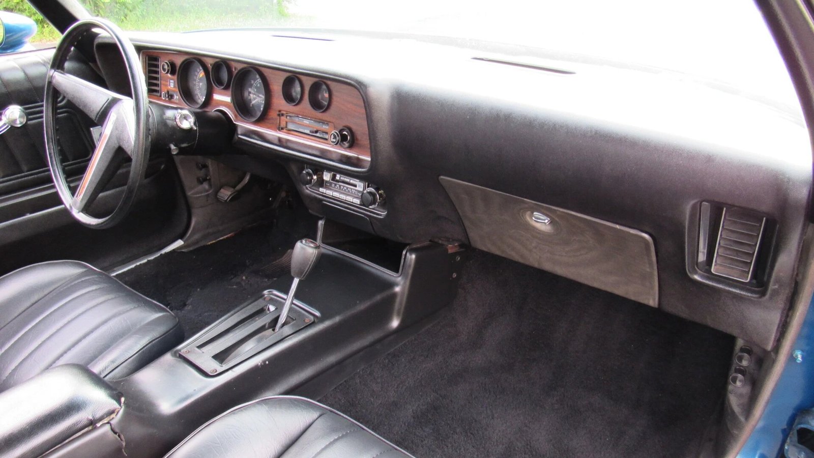 The front buckets were fitted with replacement black vinyl seat covers and are joined by a full-length center console and wooden dashboard trim.