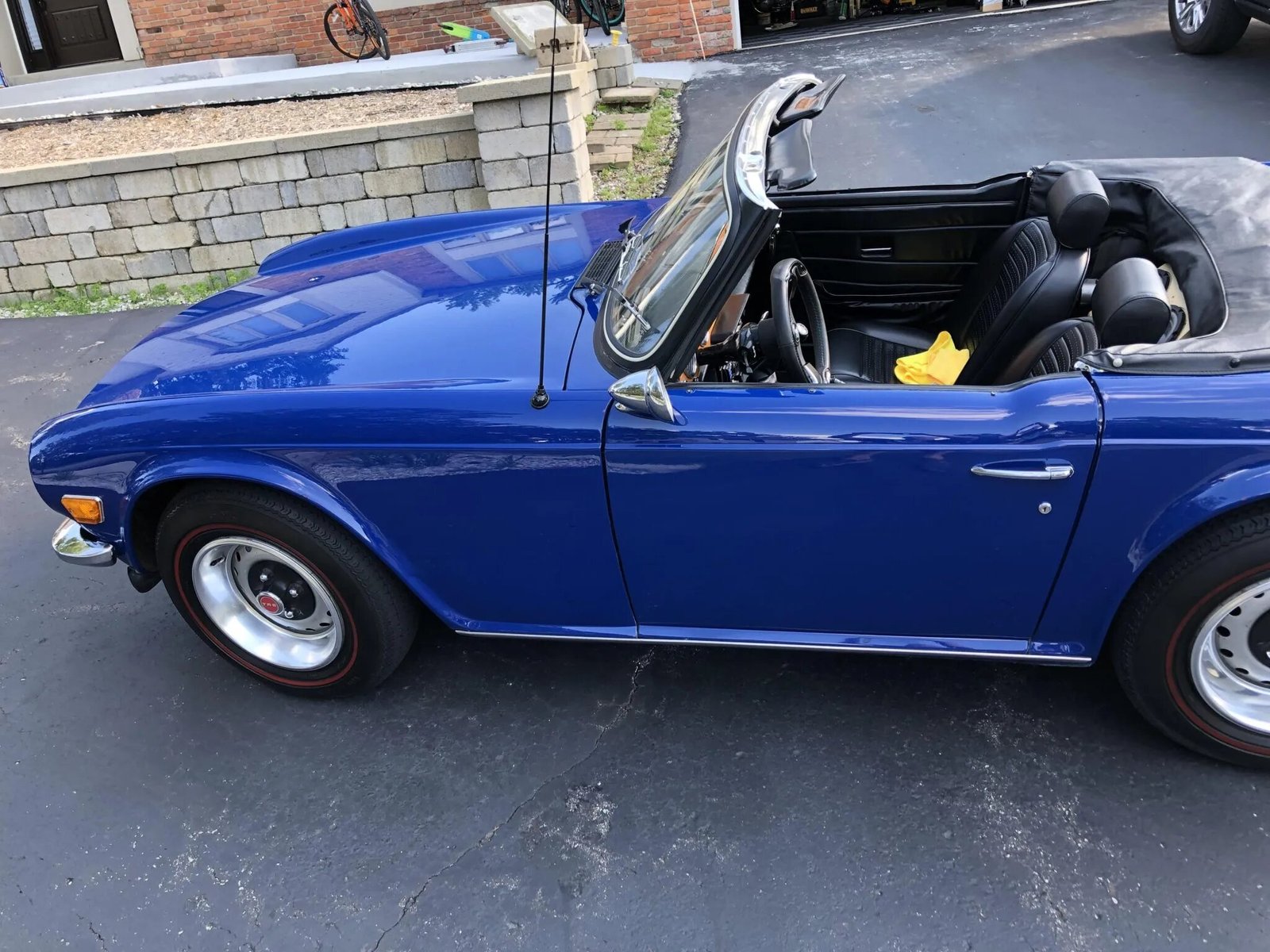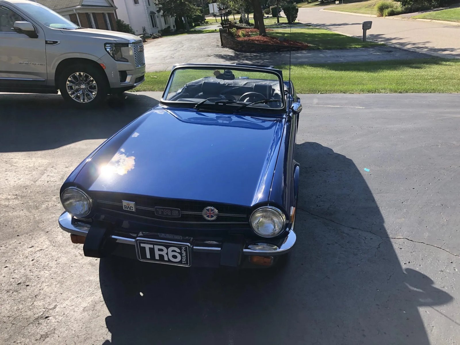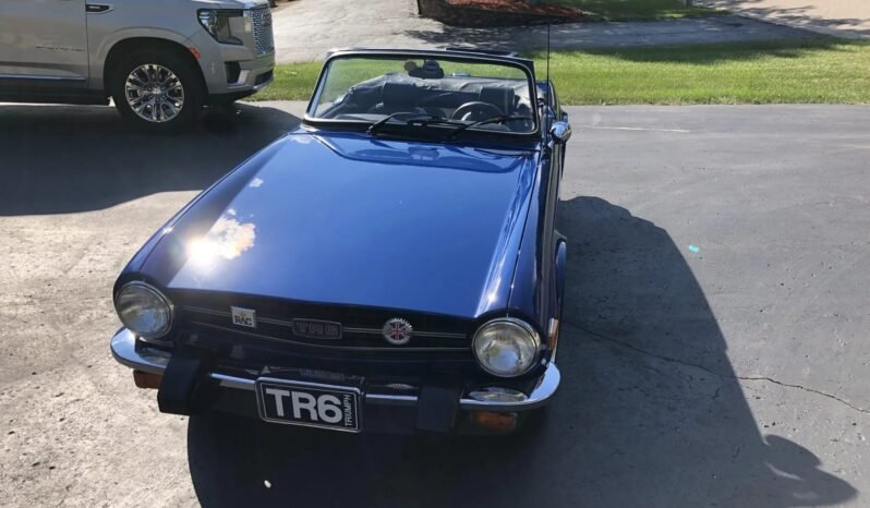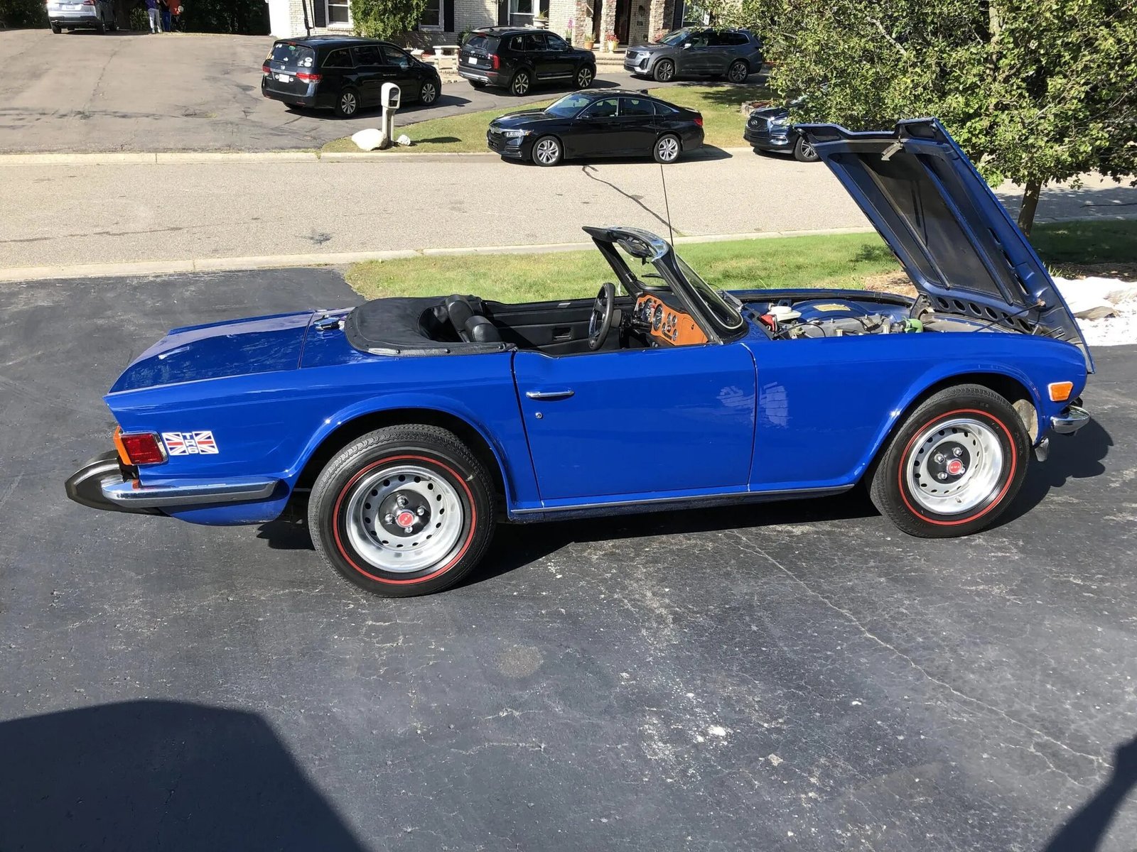 This 1976 Triumph TR6 is powered by a 2.5-liter inline-six mated to a four-speed manual transmission and is finished in blue over black vinyl upholstery. The car have been repainted, and service in preparation for sale has included a brake overhaul and replacement clutch components.