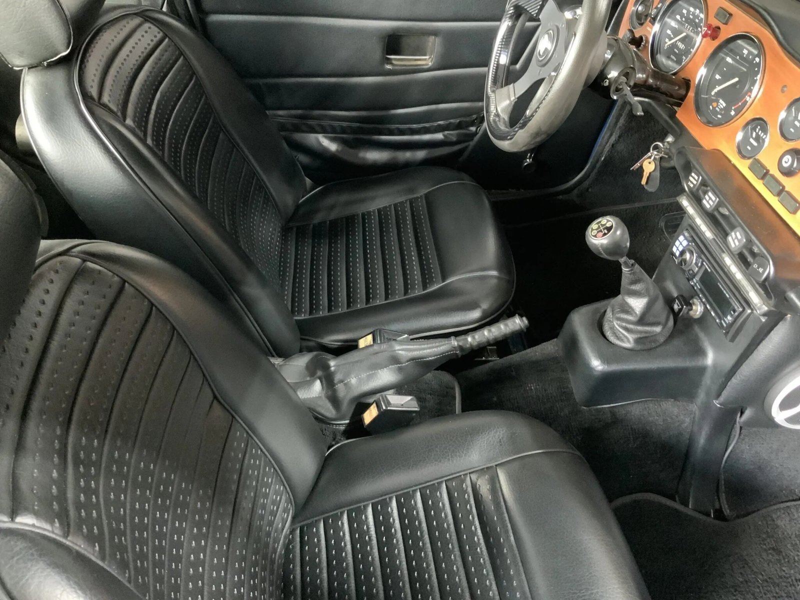 Equipment includes a retractable black soft top, a color-matched blue removable hardtop, 15″ steel wheels, chrome bumpers with black overriders, dual carburetors, power-assisted front disc brakes, quad exhaust outlets, and an Alpine sound system.