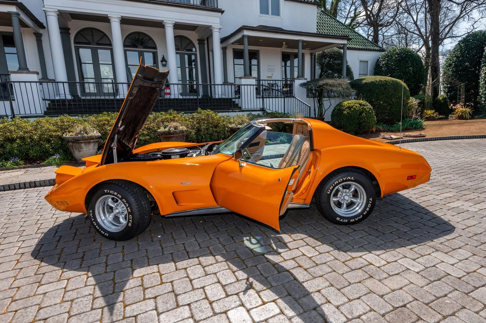 This 1977 Chevrolet Corvette is powered by a 350ci V8 paired with a three-speed automatic transmission, and it is finished in orange over tan leather upholstery.