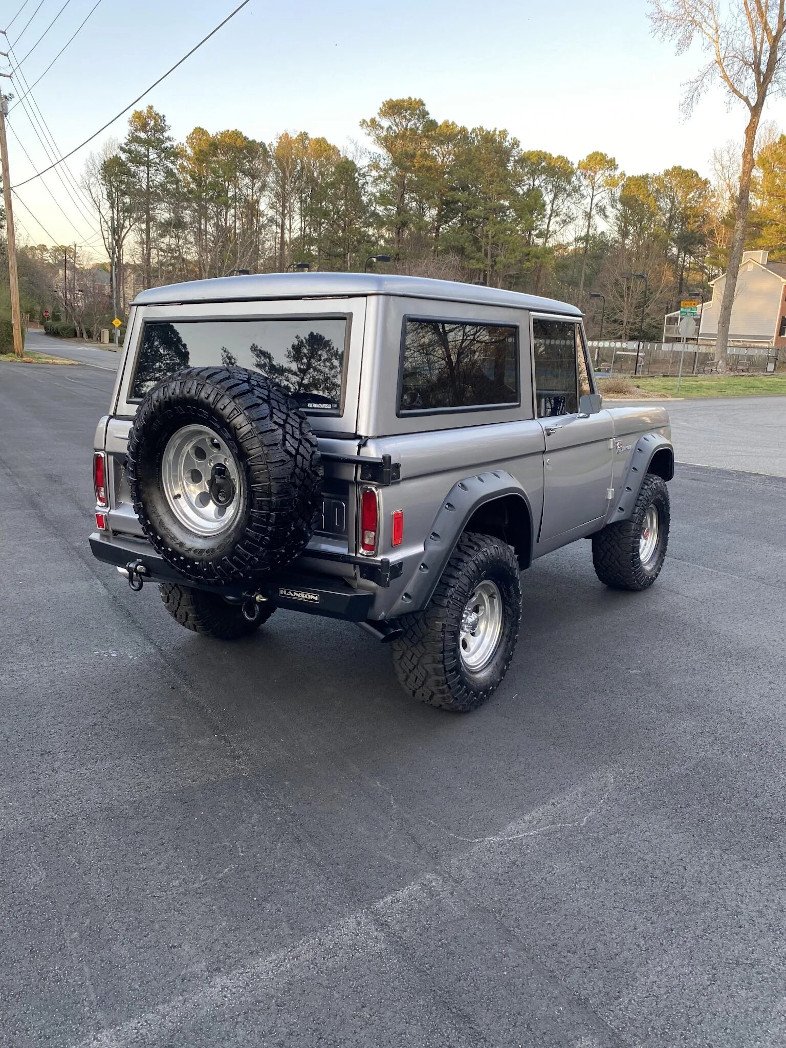 This 1977 Ford Bronco is finished in silver over black upholstery and powered by a replacement 351ci Ford V8 paired with a three-speed automatic transmission and a dual-range transfer case.