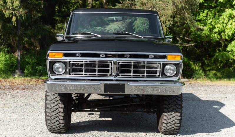 This 1977 Ford F-150 Custom 4x4 is a black-over-gray example powered by a replacement 429ci V8 mated to a four-speed manual transmission and dual-range transfer case. Subsequent work have included installing a high-performance camshaft, intake manifold, roller rockers, lifters, cylinder heads, and tubular headers along with a Skyjacker 4″ suspension lift, Nitro shocks, 15″ wheels, a Flowmaster exhaust, and a Holley carburetor. The fuel tank, radiator, carpet, grille, and headliner were replaced.