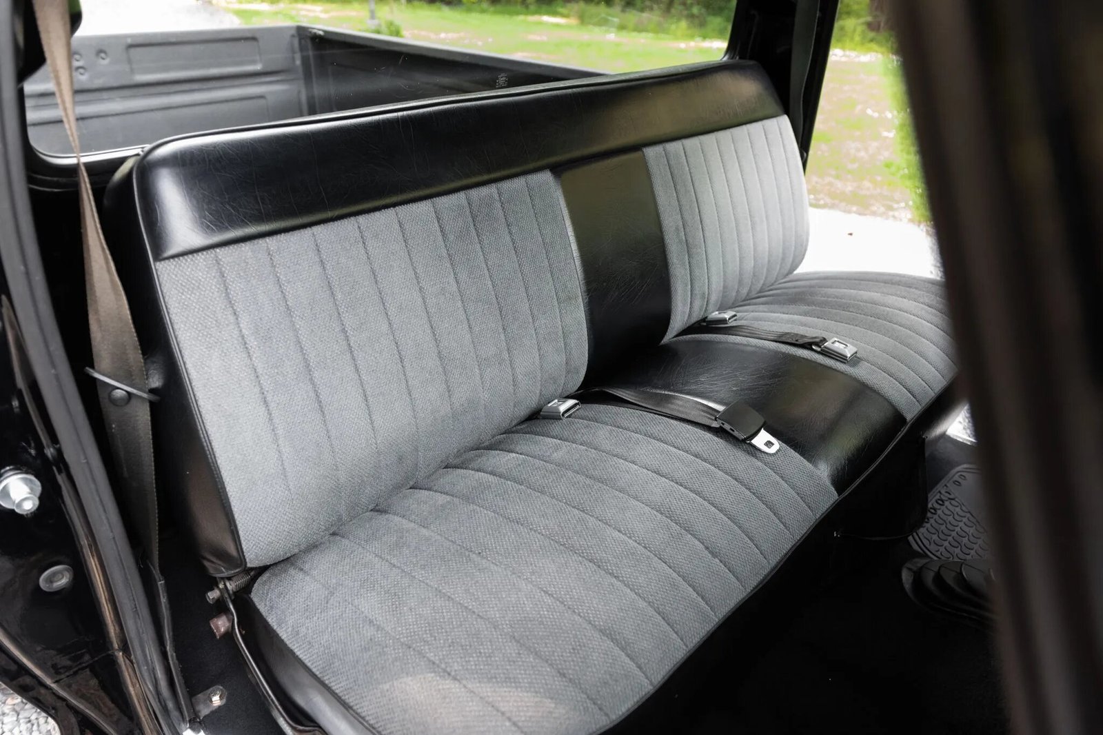 The bench seat is upholstered in black vinyl and gray fabric.