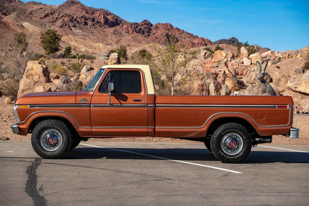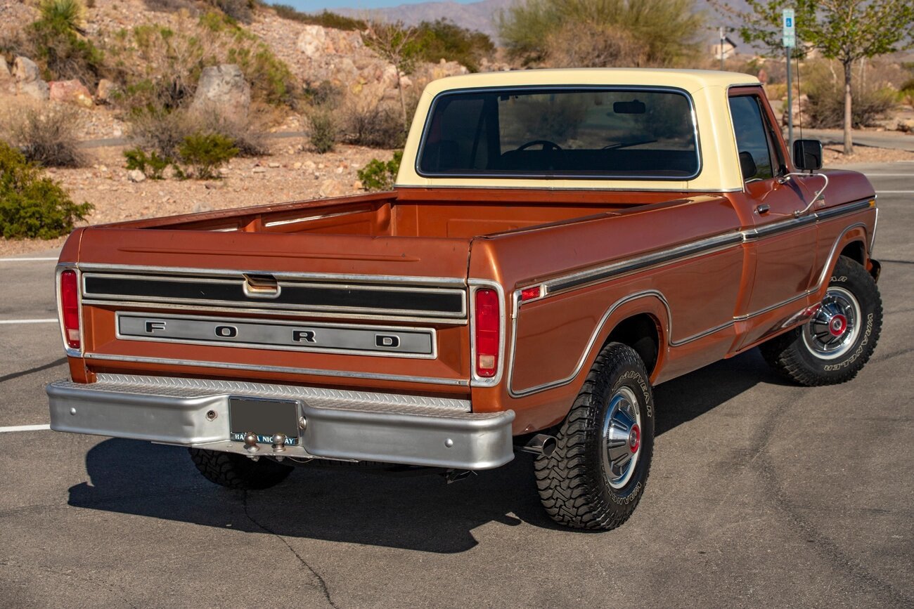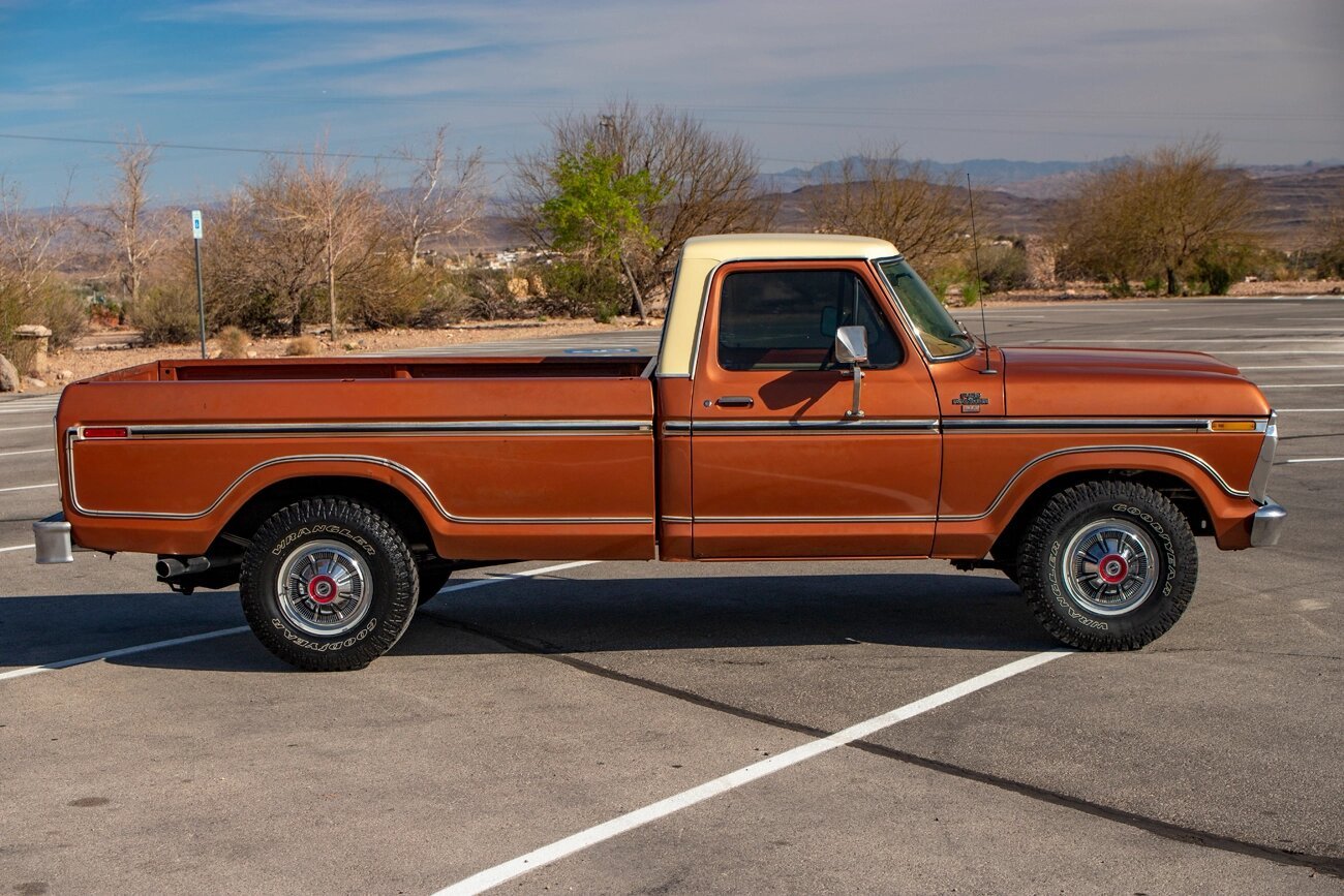 This 1977 Ford F-150 XLT Ranger pickup is finished in Copper Metallic and Indio Tan over tan vinyl and is powered by a 400ci V8 paired with a three-speed automatic transmission.
