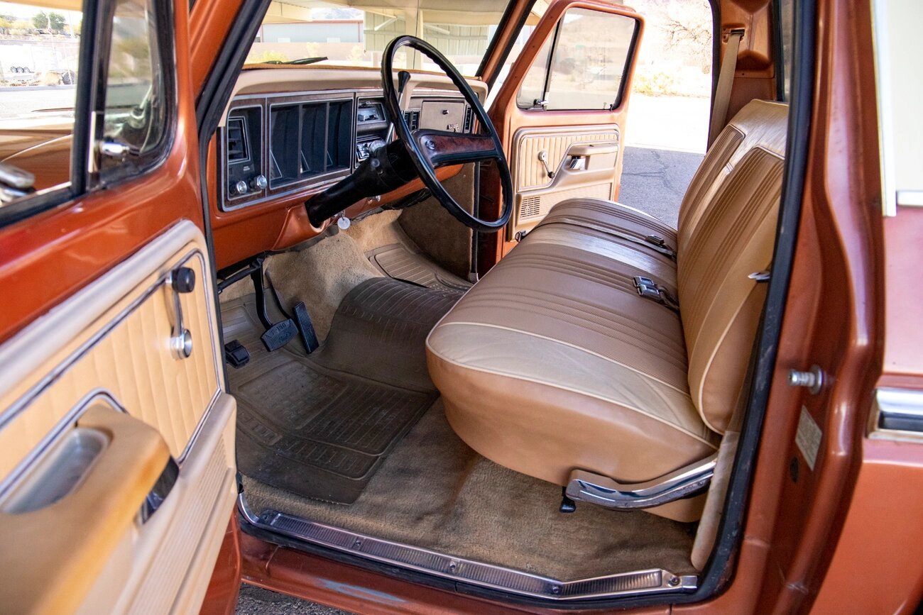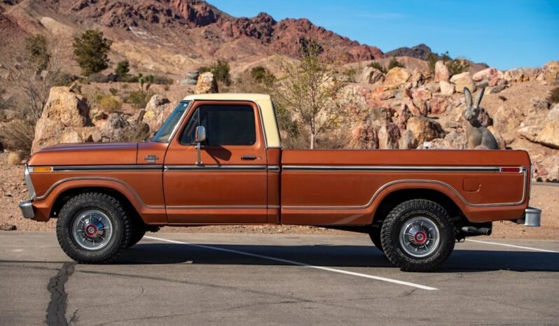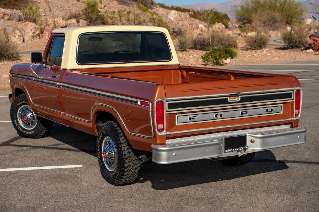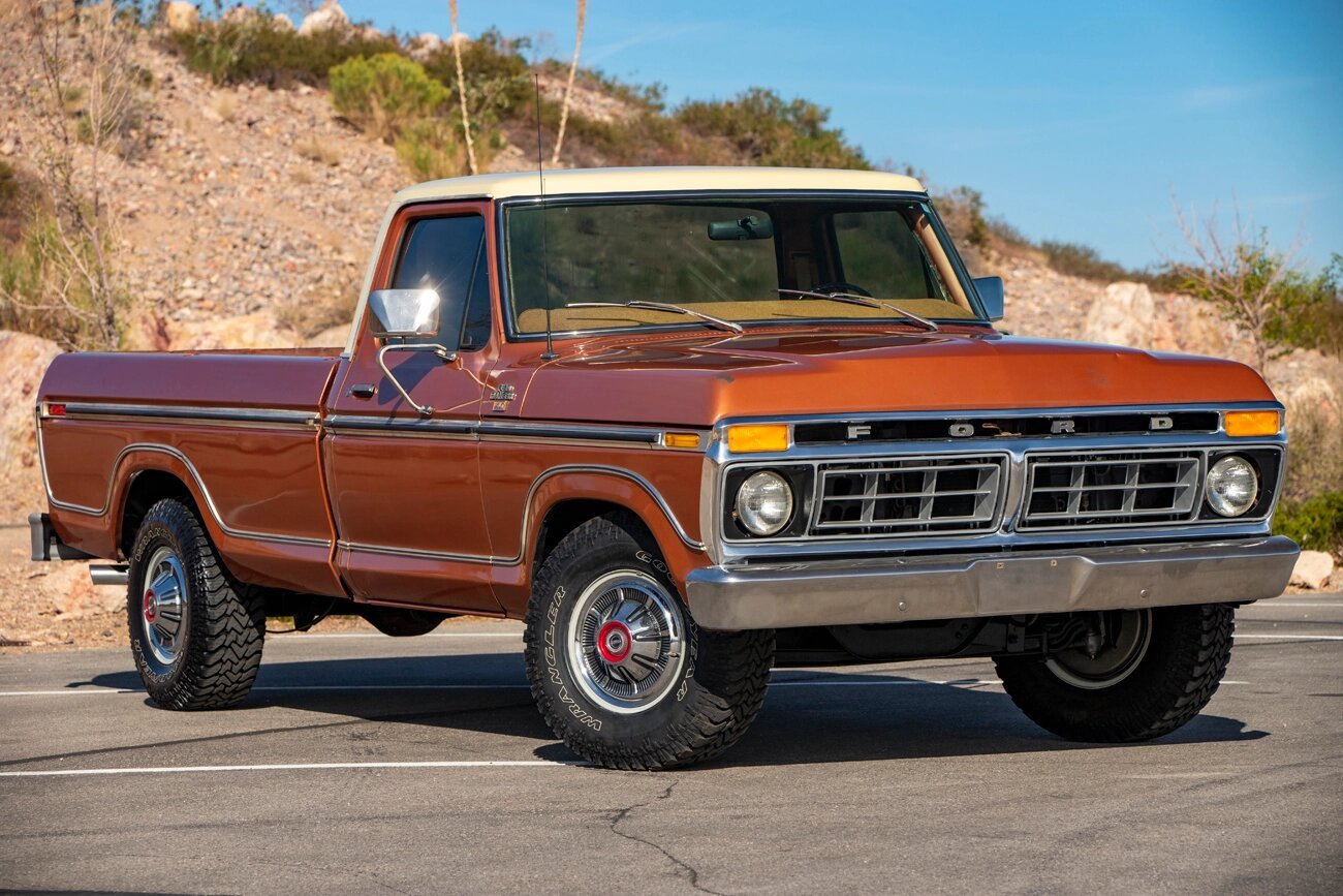 This 1977 Ford F-150 XLT Ranger pickup is finished in Copper Metallic and Indio Tan over tan vinyl and is powered by a 400ci V8 paired with a three-speed automatic transmission.