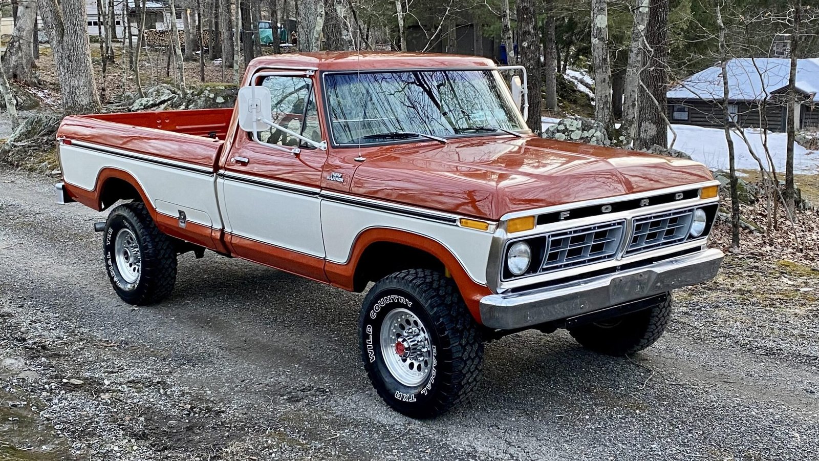 This 1977 Ford F-250 Ranger 4x4 is finished in copper and white over tan vinyl upholstery and is powered by a 351ci V8 linked to a four-speed manual transmission and a dual-range transfer case. Additional equipment includes the Ranger package and manually locking front hubs as well as 16″ aftermarket alloy wheels, front disc brakes, power steering, painted Western mirrors, a bedside toolbox, vent windows, manual-crank windows, and an AM/FM radio.
