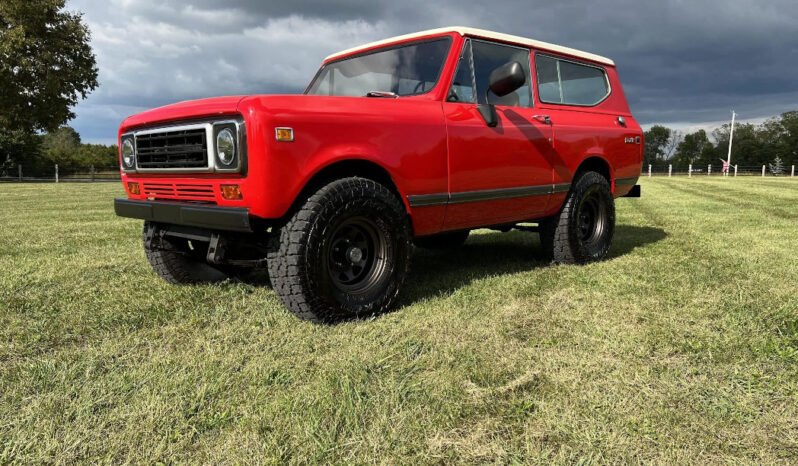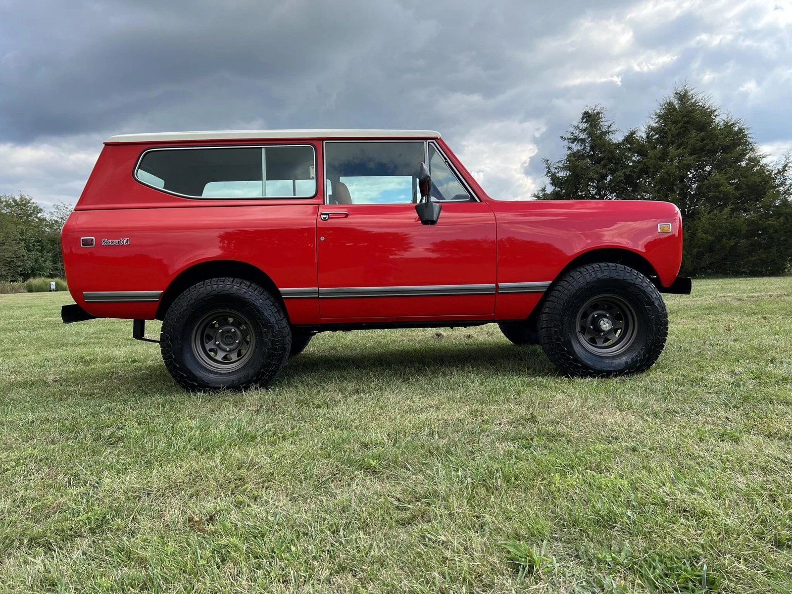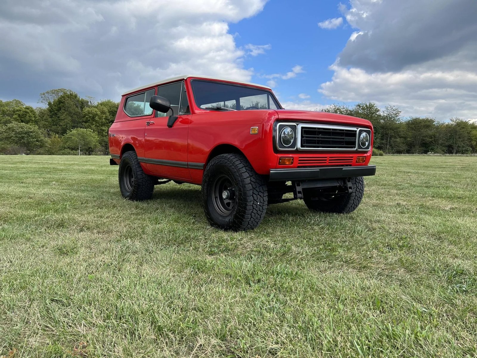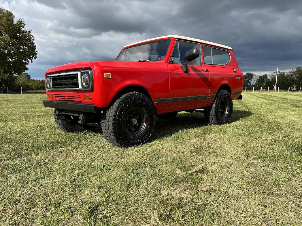 This 1977 International Harvester Scout II is finished in red with black accents over tan leather upholstery and is powered by a 345ci V8 paired with a three-speed automatic transmission and a two-speed transfer case.