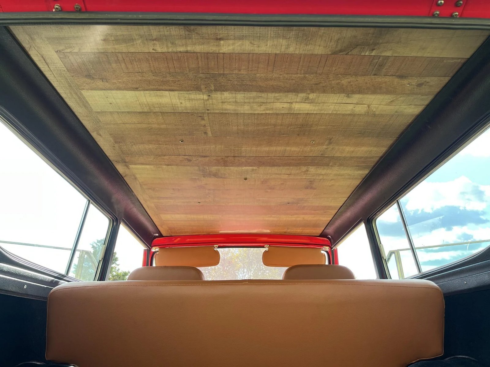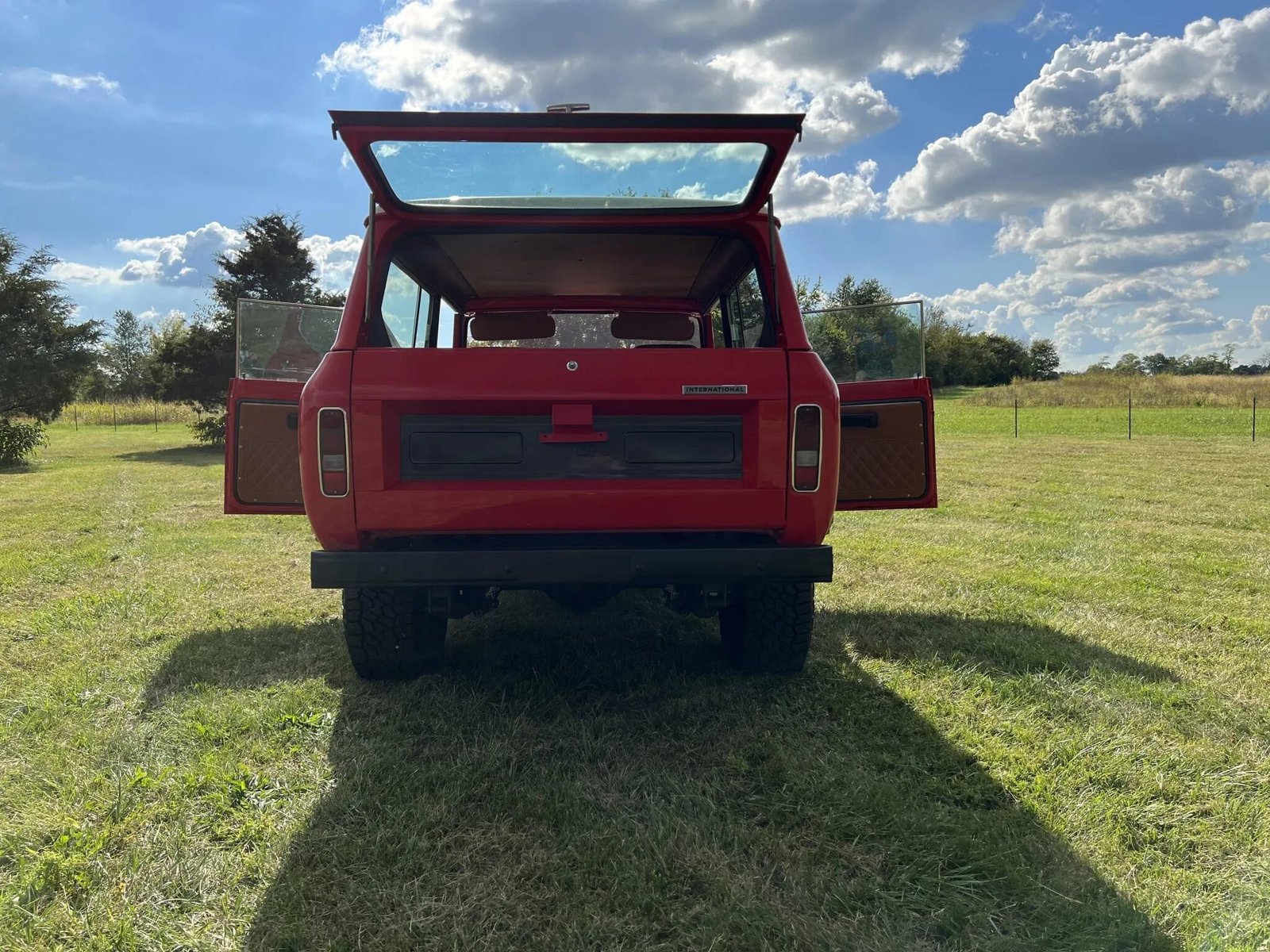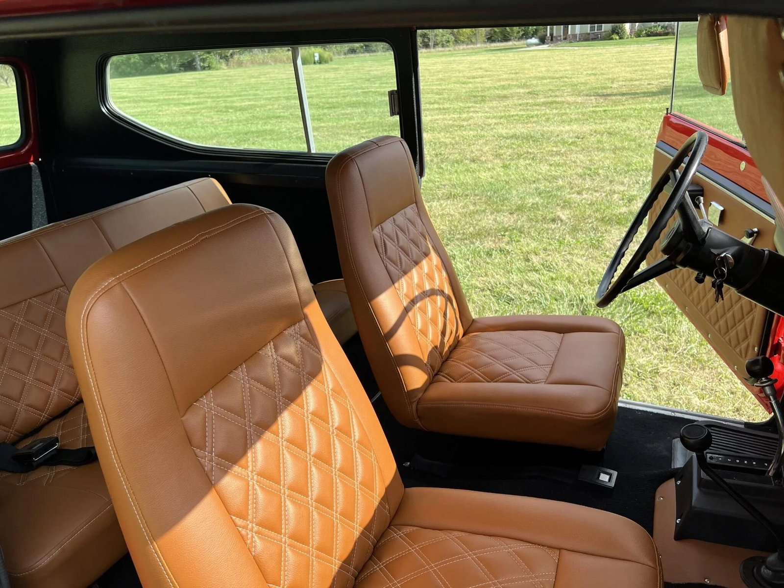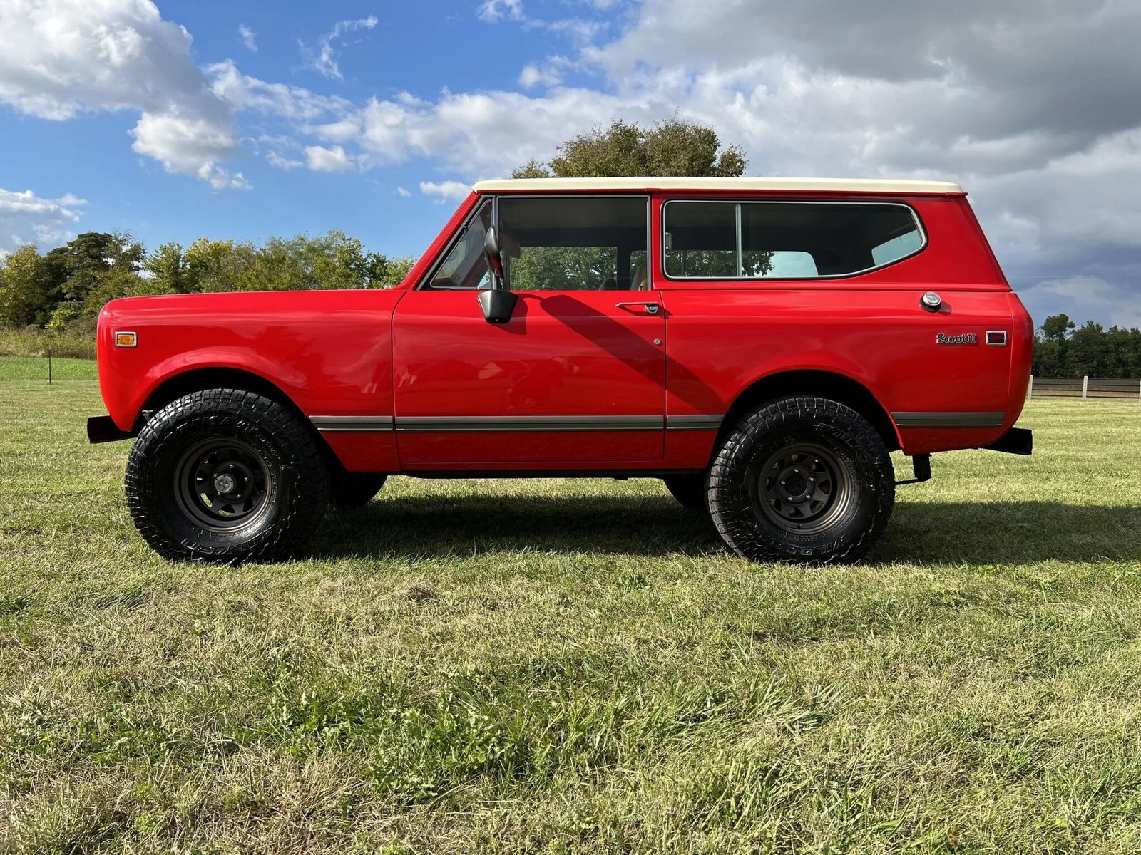 This 1977 International Harvester Scout II is finished in red with black accents over tan leather upholstery and is powered by a 345ci V8 paired with a three-speed automatic transmission and a two-speed transfer case.