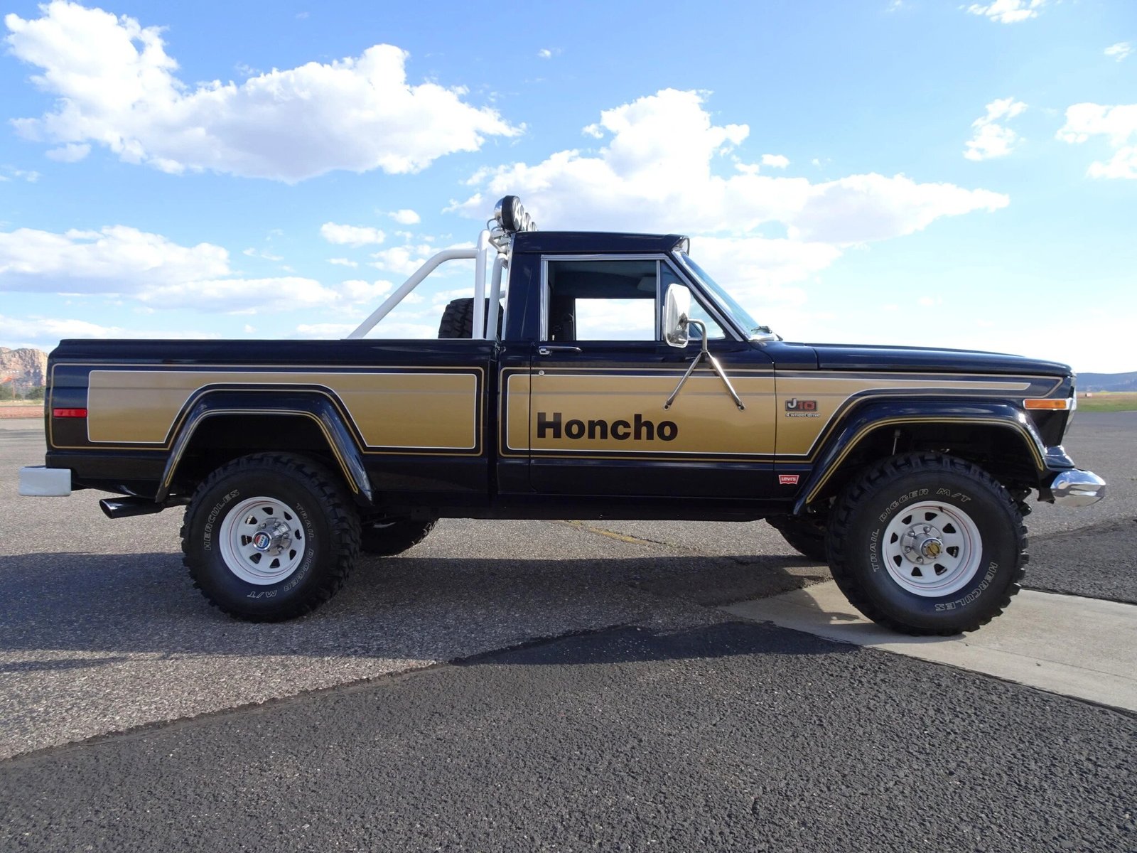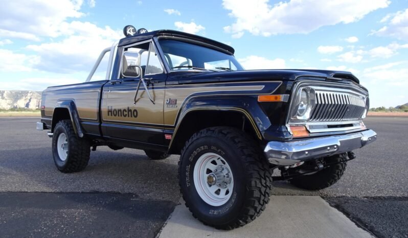 This 1977 Jeep Honcho pickup is finished in black and gold over a denim interior and powered by a 360ci AMC V8 paired with a 3-speed manual transmission.