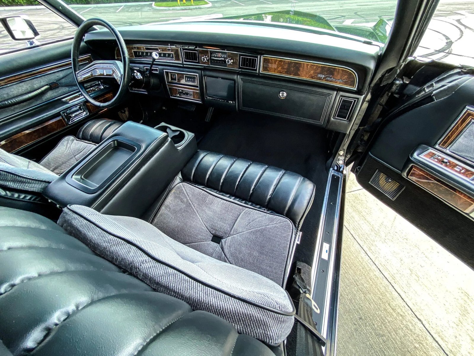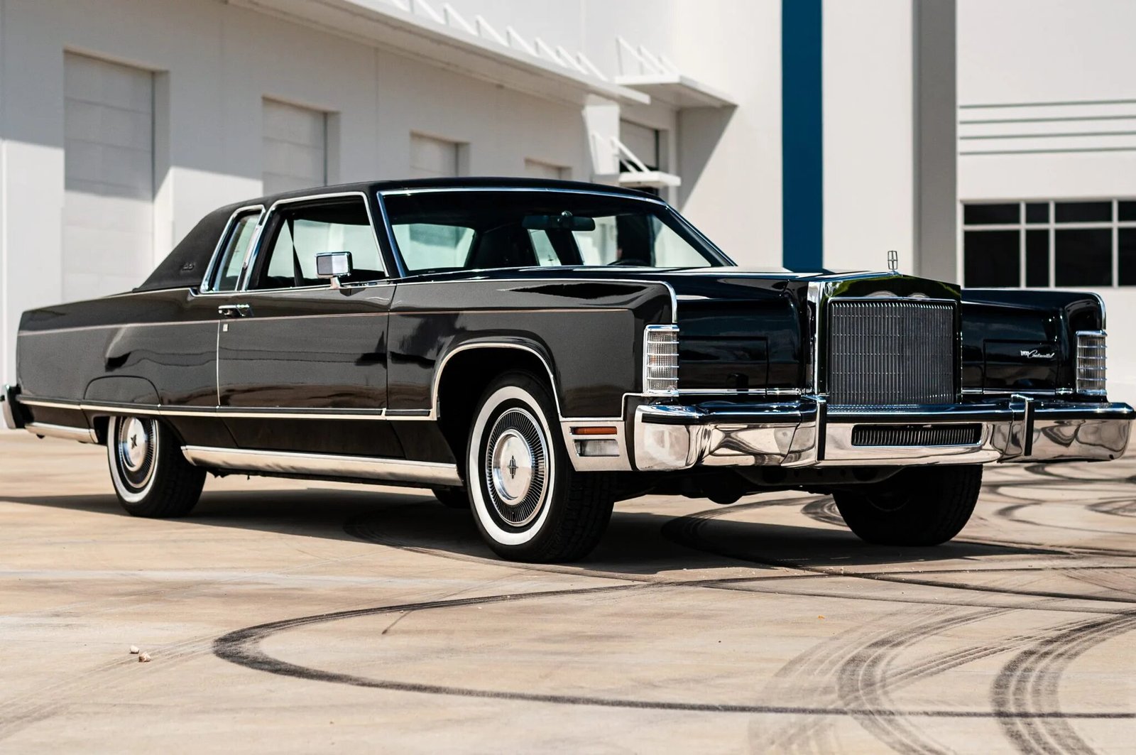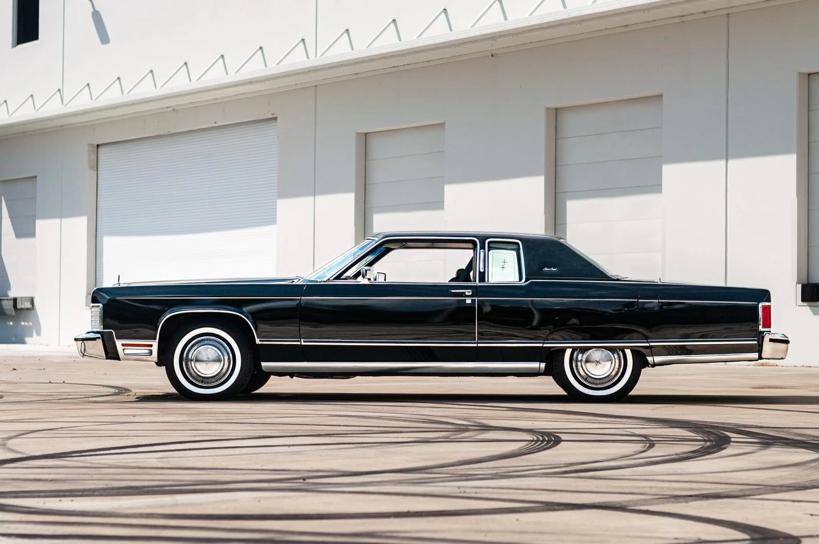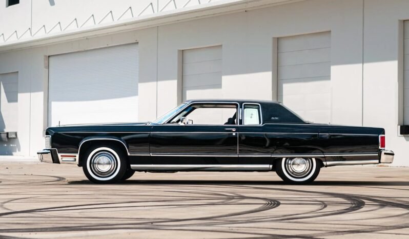 This 1977 Lincoln Continental Town Coupe is finished in black over black leather upholstery and is powered by a 460ci V8 paired with a three-speed automatic transmission. FiTech fuel injection, QA1 rear shocks, and an Alpine touchscreen stereo have been added, and additional equipment includes a black vinyl roof, retractable headlight doors, cornering lights, 15″ wheels, air conditioning, power-adjustable front seats, a fold-down center console with cupholders, cruise control, and a Cartier clock.