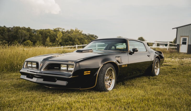This 1977 Pontiac Firebird Trans Am was fitted with a 417ci stroker LS3 V8 mated to a Tremec T56 six-speed manual transmission and refinished in black over black and gold upholstery as part of a refurbishment completed by GKR Motorcars in October 2022. Additional equipment and modifications include a Currie 9″ rear axle with a 3.70:1 limited-slip differential, UMI Performance control arms, adjustable front coilovers, 17″ snowflake-style alloy wheels, Wilwood disc brakes, a shaker hood, Trans Am graphics, Recaro bucket seats, air conditioning, a microsuede-wrapped steering wheel, Dakota Digital instrumentation, and a vintage-look stereo.
