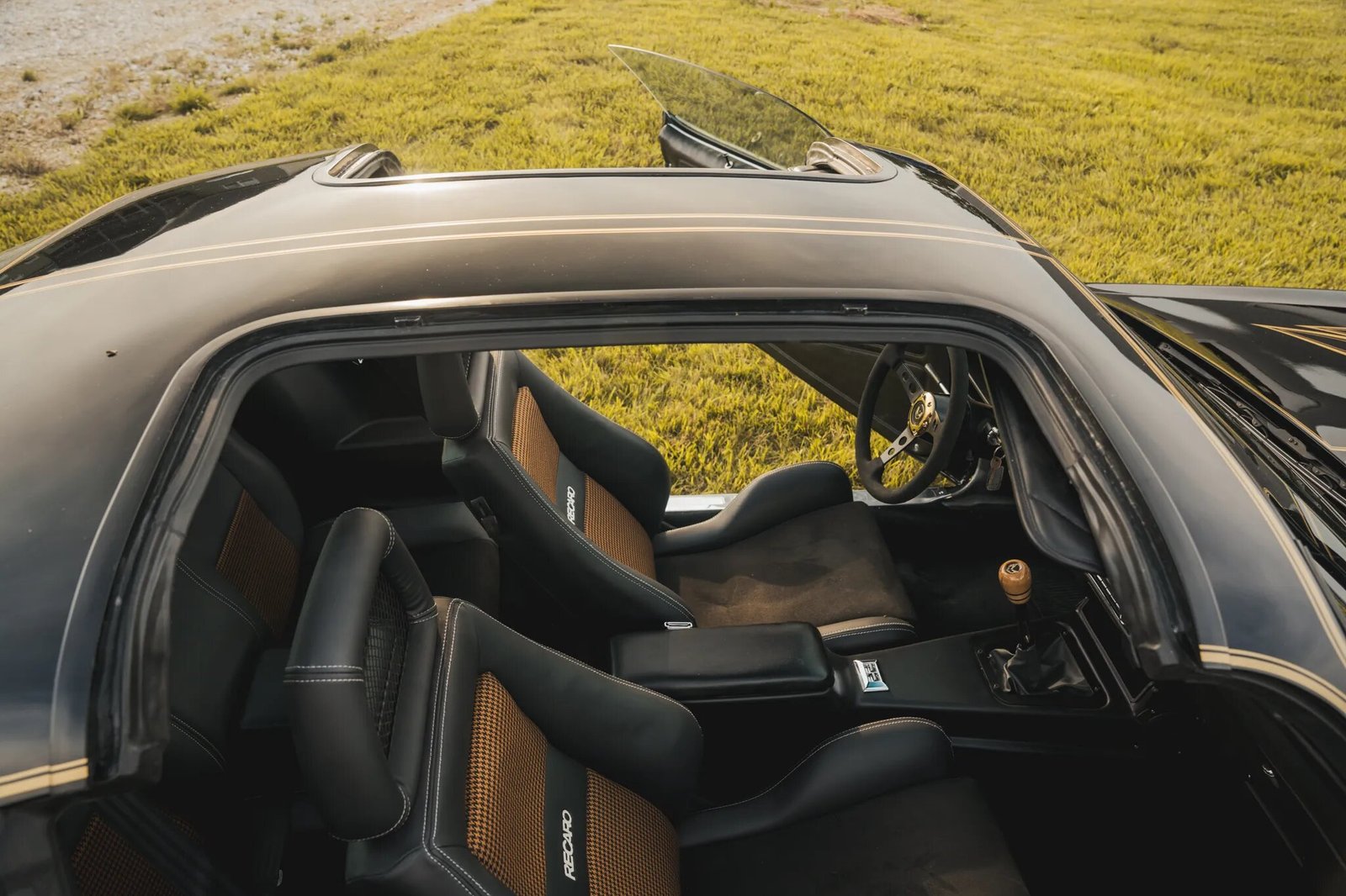 The retrimmed interior features Recaro front bucket seats upholstered in black with gold patterned cloth inserts.