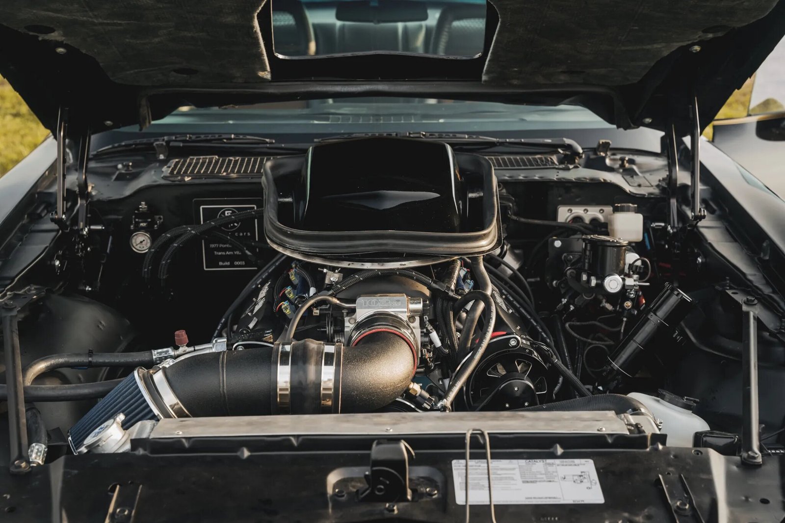The LS3 V8 was stroked to 417ci and equipped with Holley Terminator electronic fuel injection, a 102mm electronic throttle body, Racetronix fuel rails, an aluminum radiator, and Trans Am-branded billet valve covers.