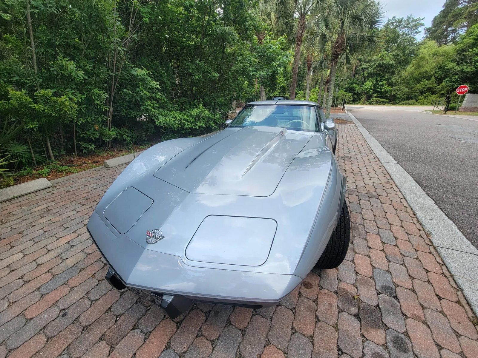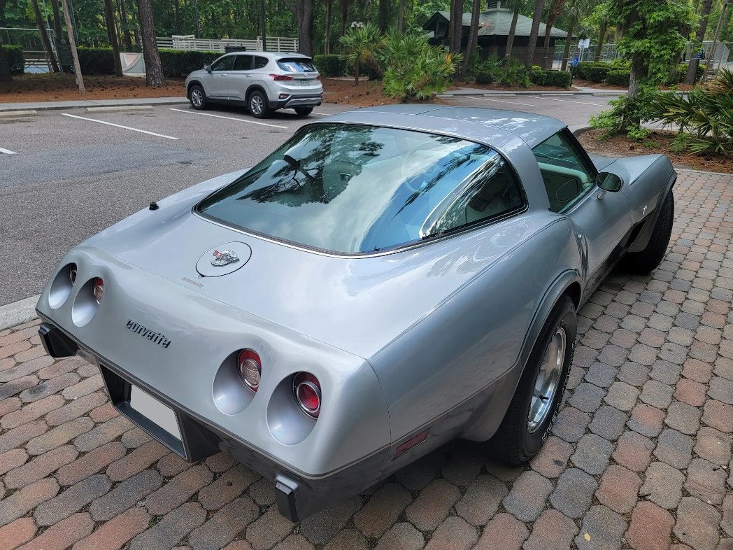 Amenities include air conditioning, power-operated windows, a locking glovebox, Corvette-branded floor mats, and a Delco AM/FM 8-track push-button stereo.