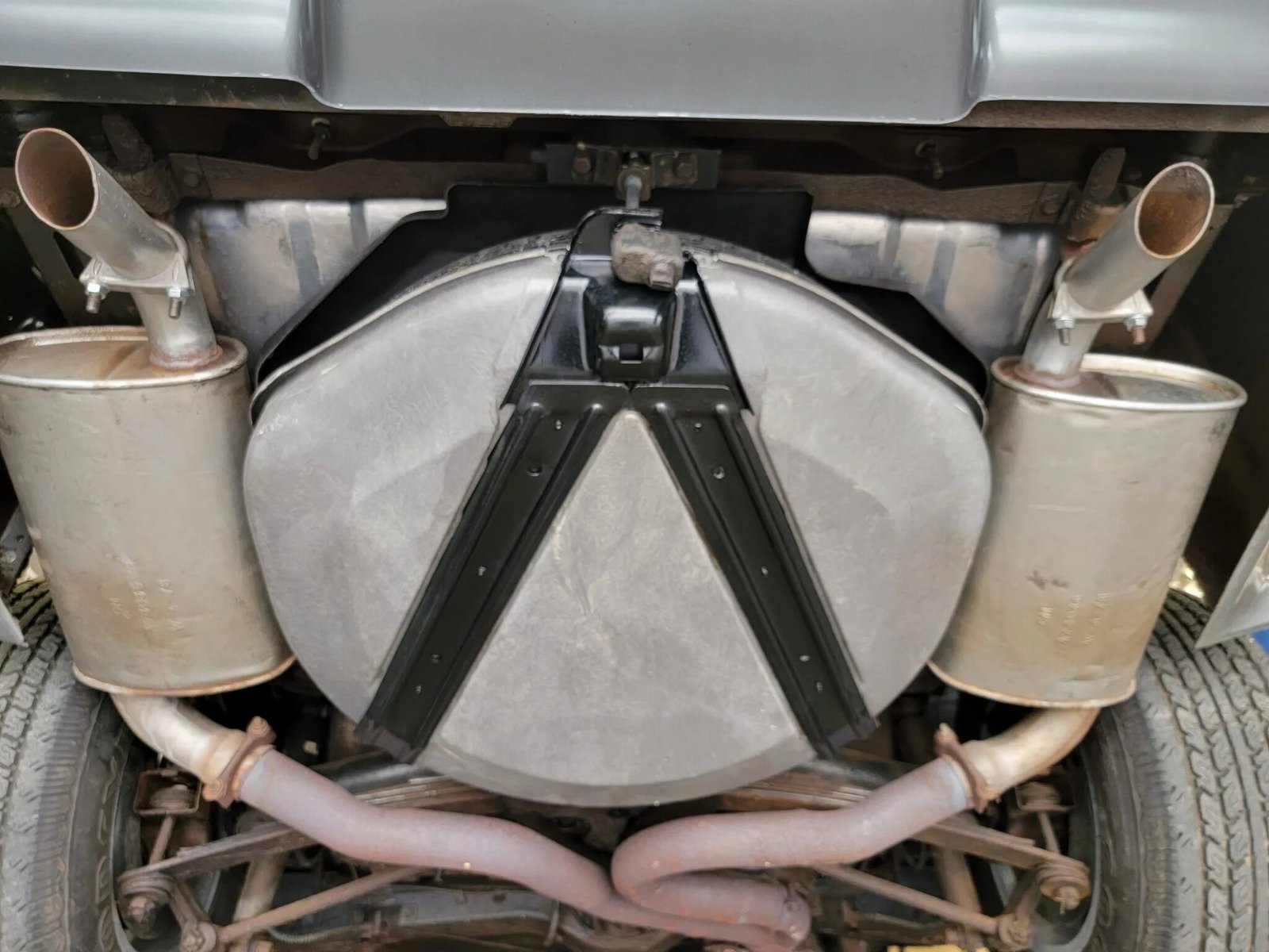 Polished 15″ slotted aluminum wheels are mounted with 255/60 Goodyear GT Radial tires.