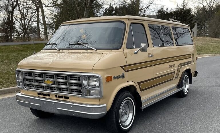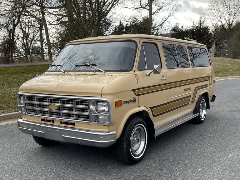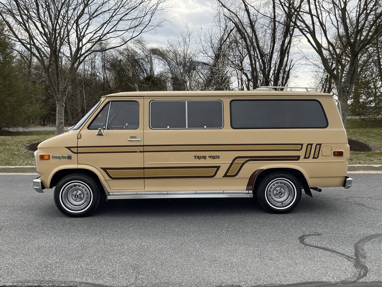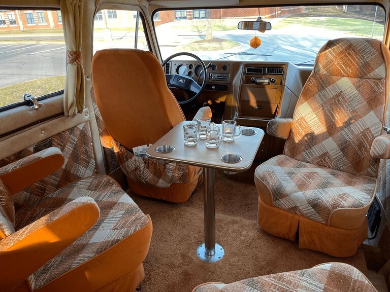 This 1978 Chevrolet G20 van was modified by Compliment/Barrows Enterprises with their Trans Vista conversion package and was sold new in 1978.The van is finished in tan with brown and gold graphics over orange cloth upholstery, and power is provided by a 350ci V8 mated to a three-speed automatic transmission. The rear cabin has been fitted with camper-style amenities consisting of a convertible couch/bed, a sink, a cooler, and two tables with integrated cup holders. Additional equipment includes air conditioning, cruise control, 15″ Rally wheels, power steering, power front disc brakes, four swiveling captain’s chairs, and a push-button AM/FM/eight-track stereo.