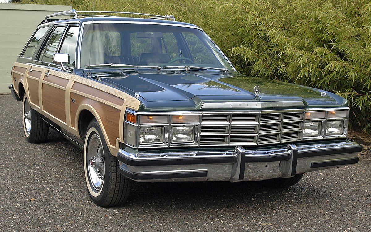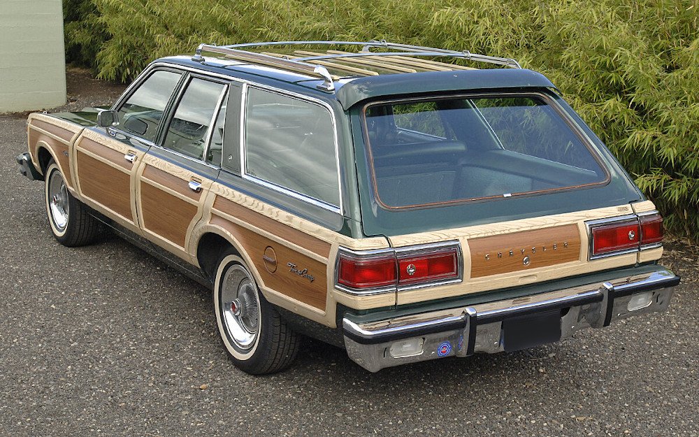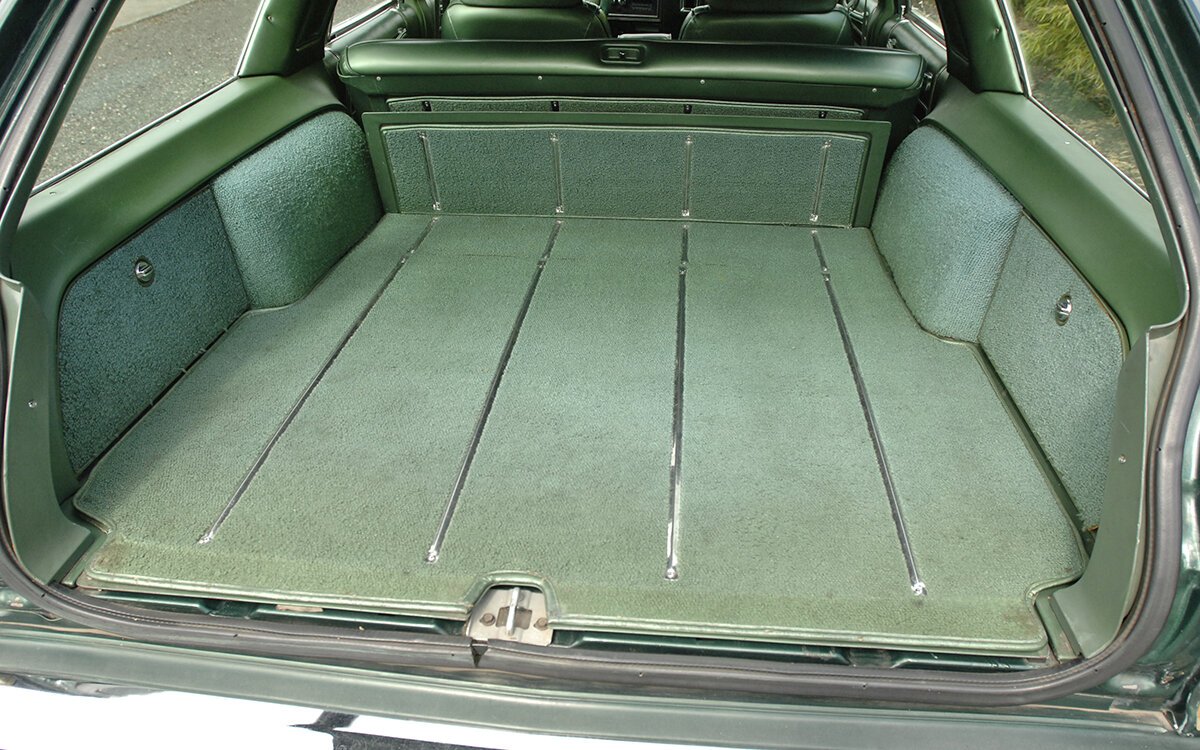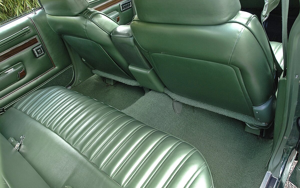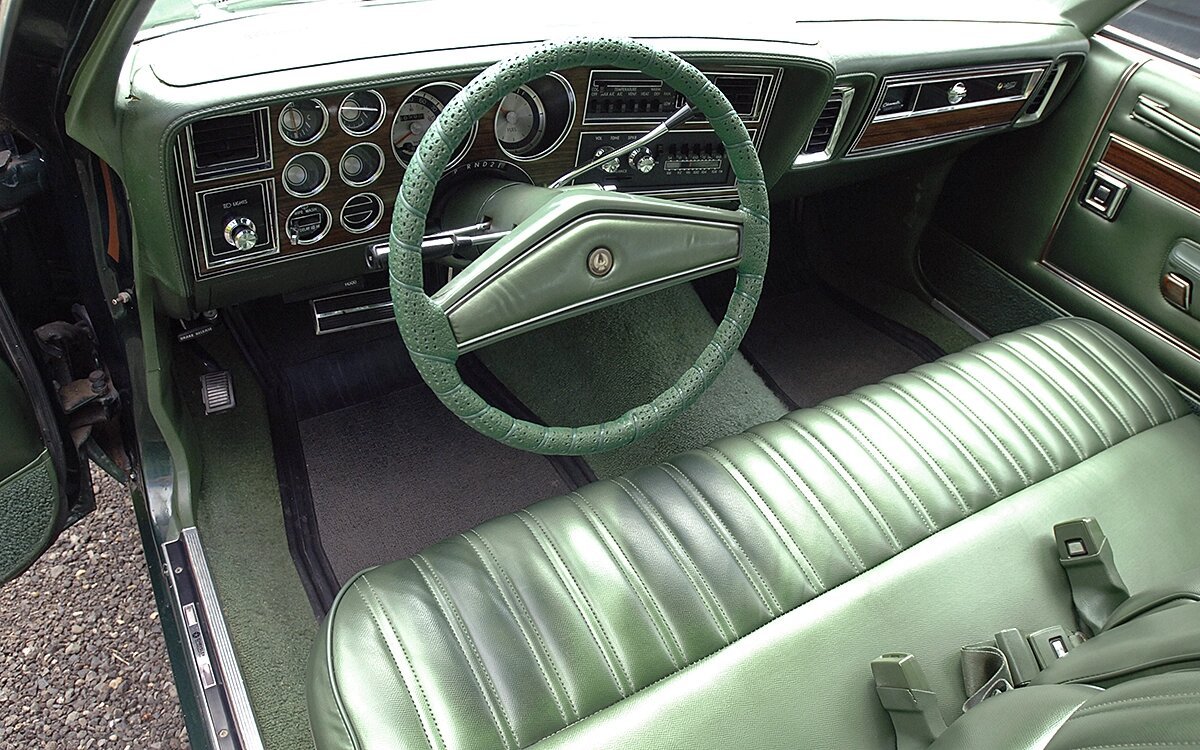 Inside, the green vinyl upholstery is accented with wood trim on the door panels and dashboard.