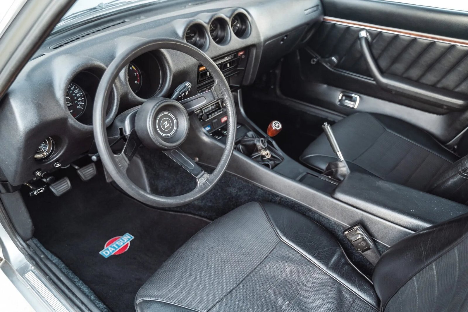 The interior features bucket seats upholstered in black vinyl along with a color-coordinated dashboard cap, door panels, and carpeting. Equipment includes a push-button AM/FM stereo, a heated rear window, a wooden shift knob, a lockable glovebox, Datsun-branded floor mats, and crank windows. The air conditioning system was recharged in preparation for the sale.