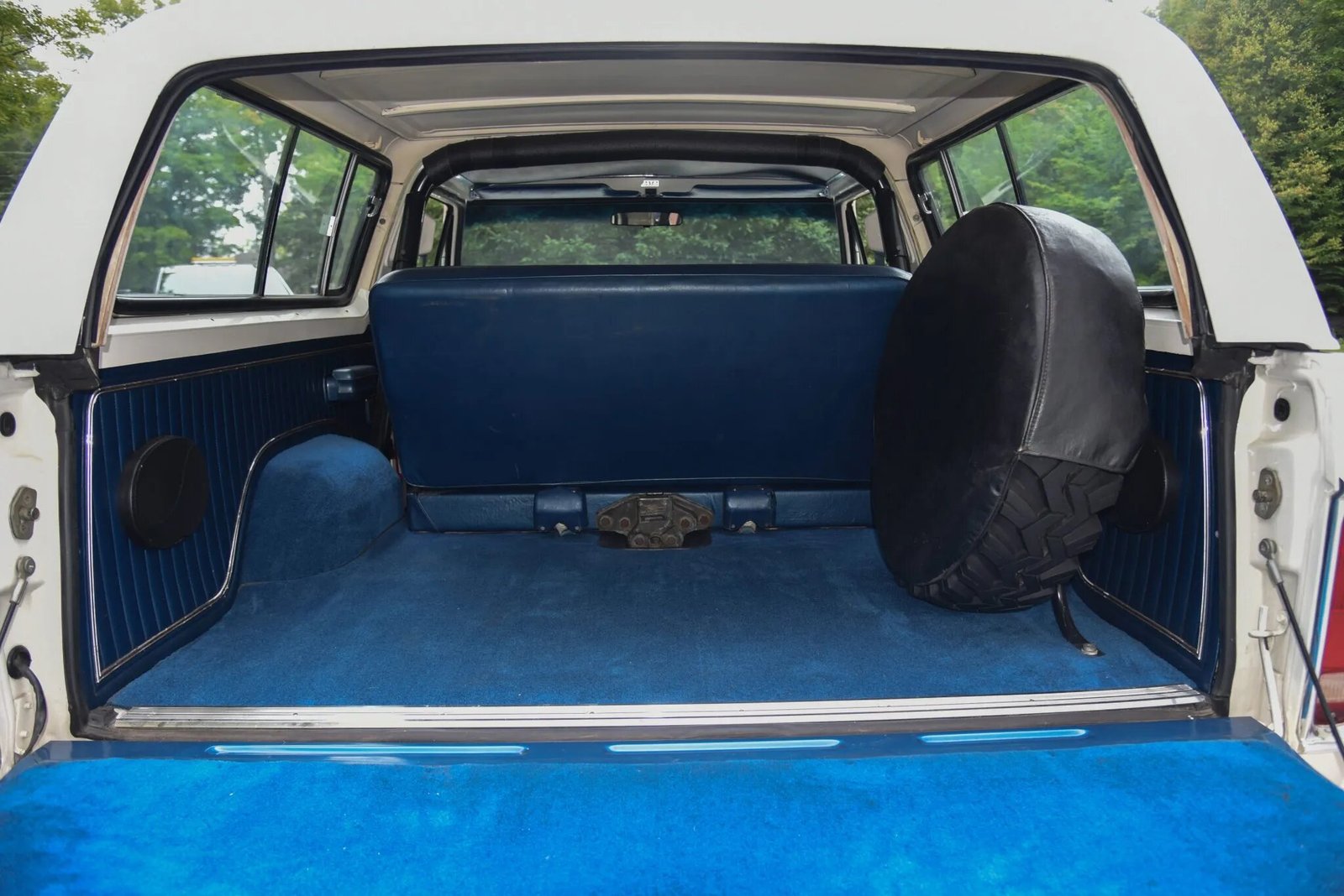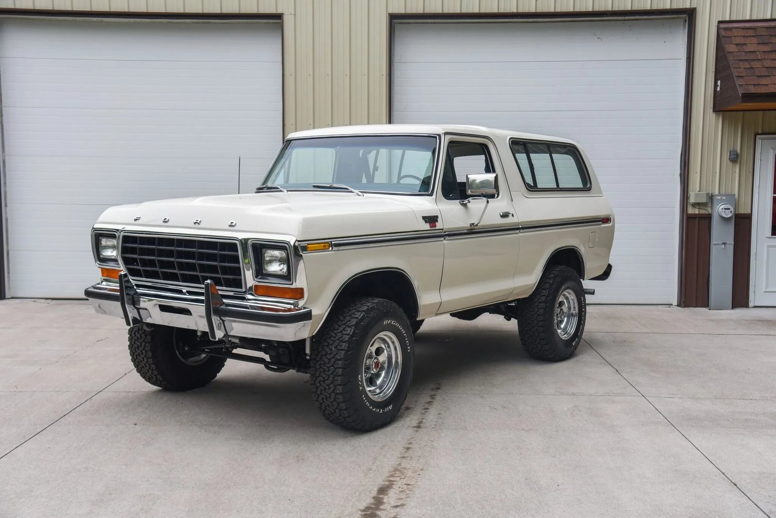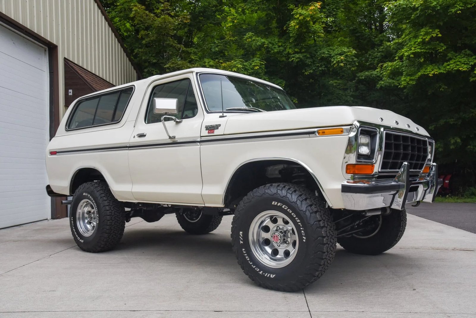 This 1978 Ford Bronco Ranger XLT is finished in white over two-tone blue vinyl and is powered by a 351ci V8 mated to a three-speed automatic transmission and a dual-range transfer case. Equipment includes the Handling Package, a limited-slip rear axle, 16″ aluminum wheels, power-assisted front disc brakes, and locking front hubs in addition to a removable fiberglass hardtop, front tow hooks, chrome bumpers, a padded GT roll bar, an AM/FM stereo, power steering, cruise control, and air conditioning.