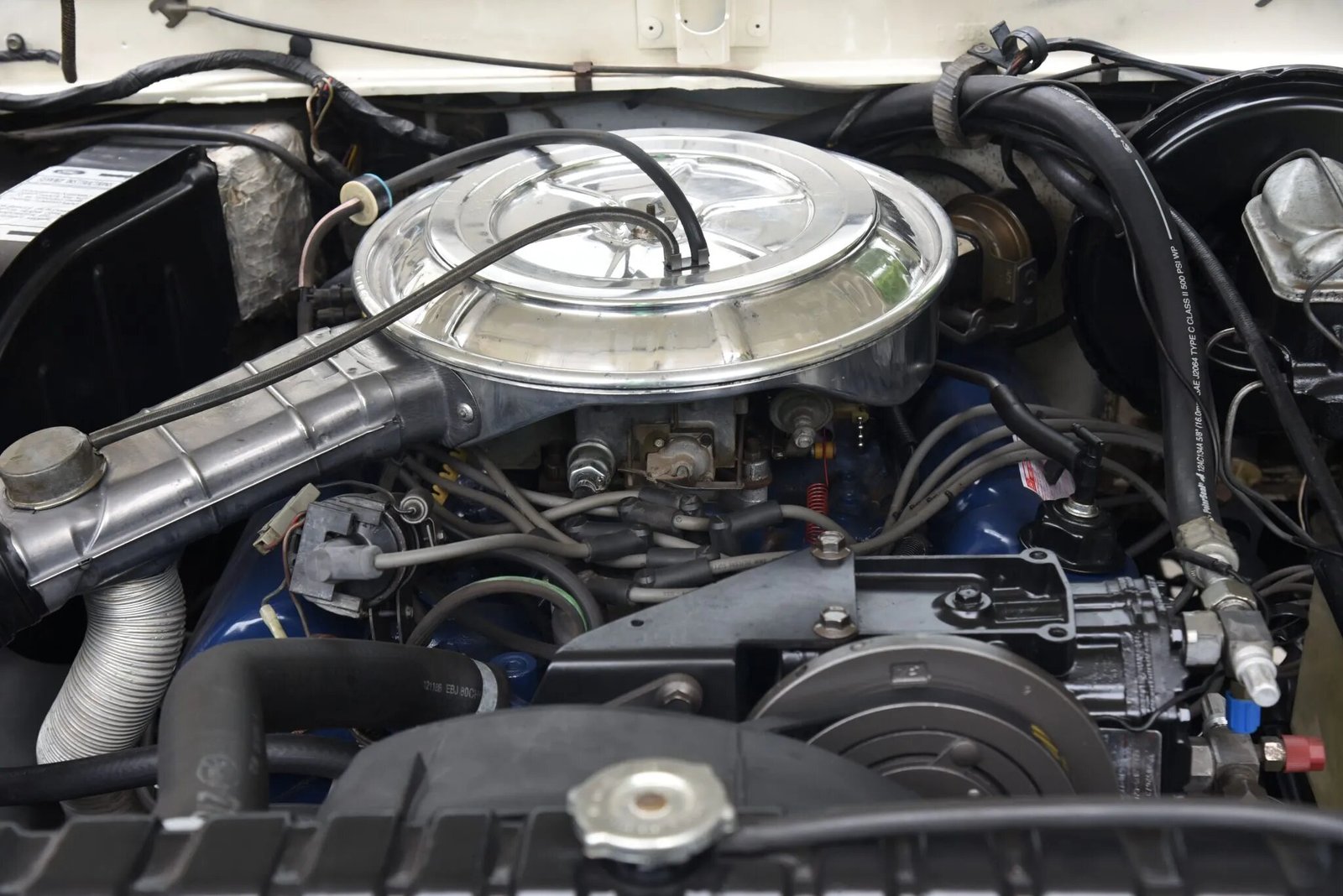 The 351ci V8 was factory rated at 156 horsepower and 262 lb-ft of torque. Work in 2023 included replacing the bearings, piston rings, camshaft, lifters, valve seals, and water pump. A dual exhaust system with Flowmaster Flow FX mufflers is equipped.