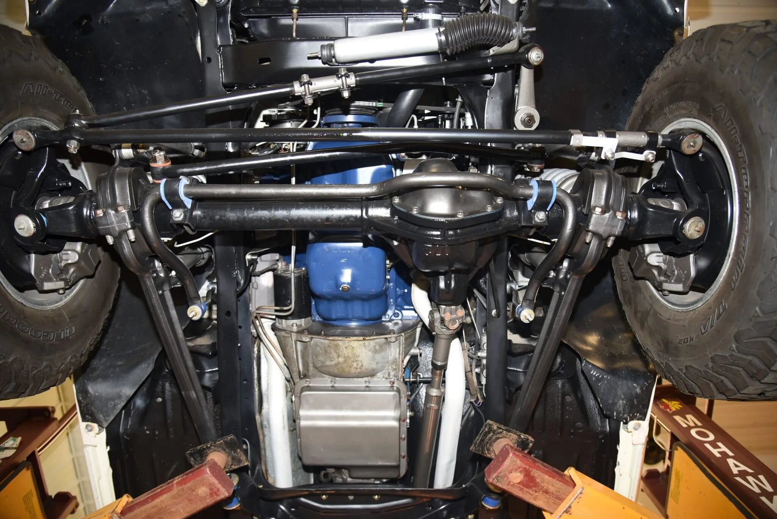 Eight-hole 16″ aluminum wheels are mounted with 295/75 BFGoodrich All-Terrain T/A tires. Stopping power is provided by power-assisted front discs and rear drums. The truck is equipped with front and rear stabilizer bars, power steering, and locking front hubs. A 2″ Skyjacker suspension lift is installed.
