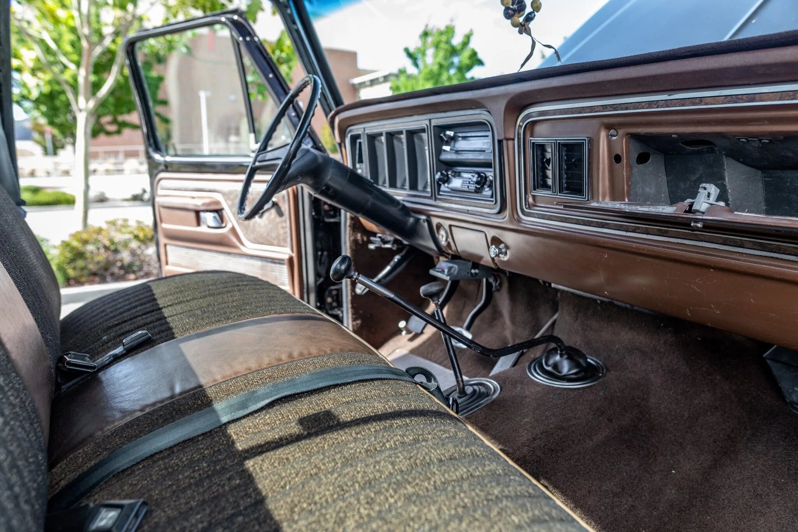 The cabin features a bench seat upholstered in brown vinyl with cloth seating surfaces, matching replacement carpets, and metal surfaces painted in the color of the body.