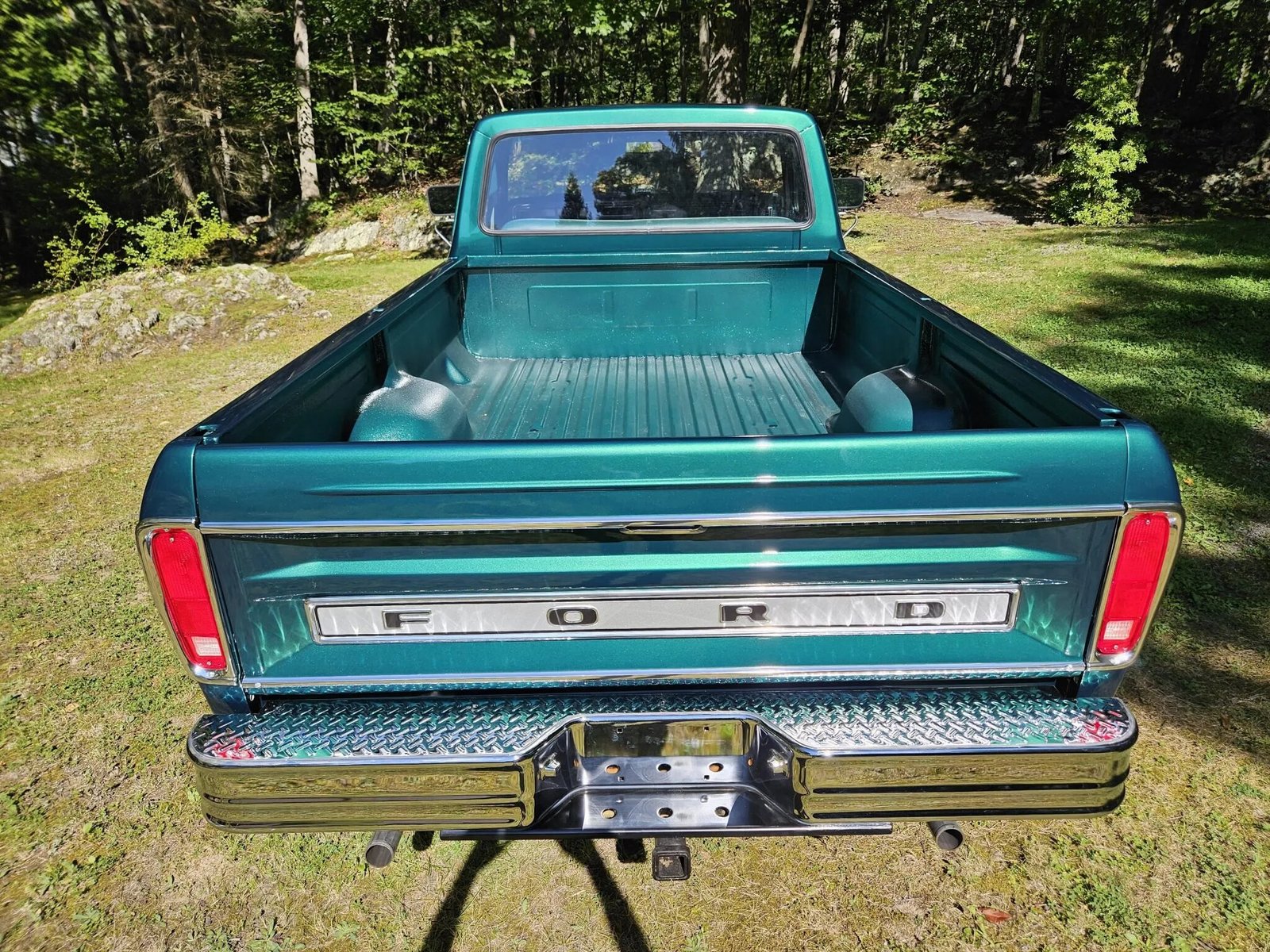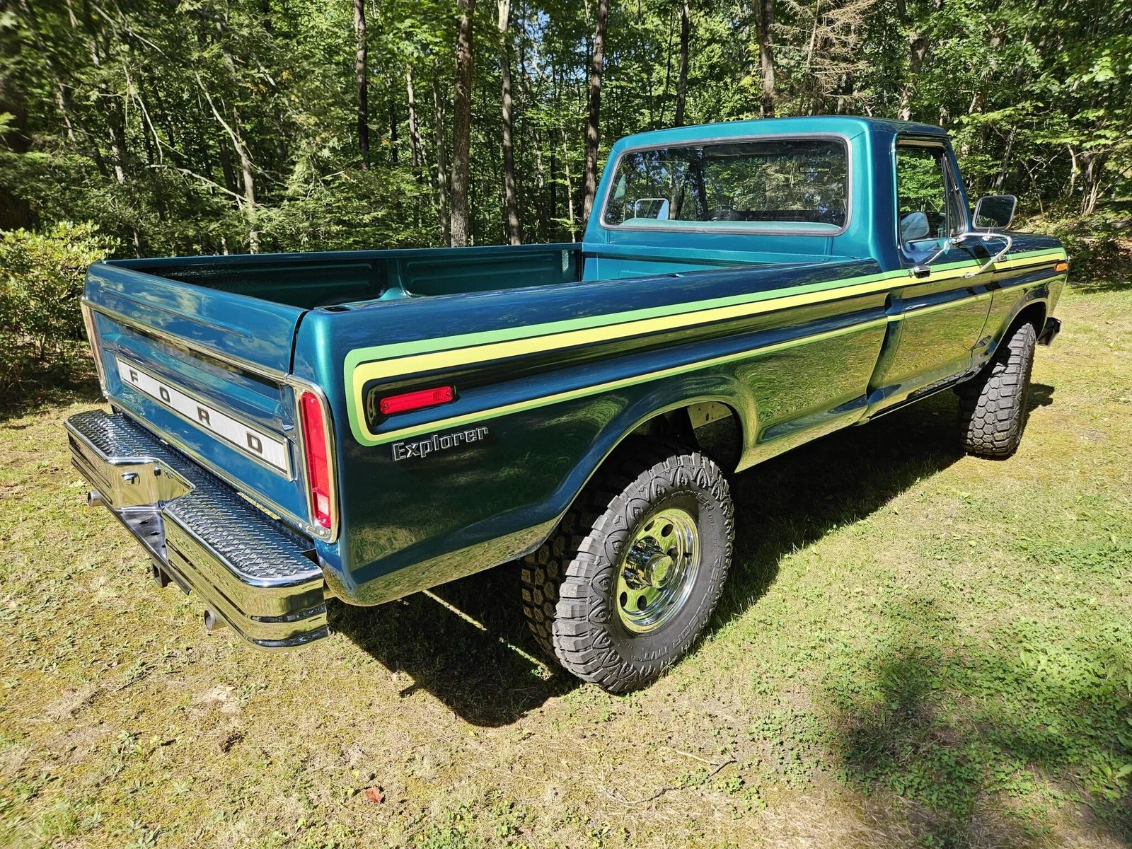 The truck left the factory finished in Dark Jade Metallic and was refinished in 2023. Features include a Styleside bed as well as the Explorer stripe and badging package, dual towing mirrors, a receiver hitch, chrome front and rear bumpers, a push bar, and KC off-road light.