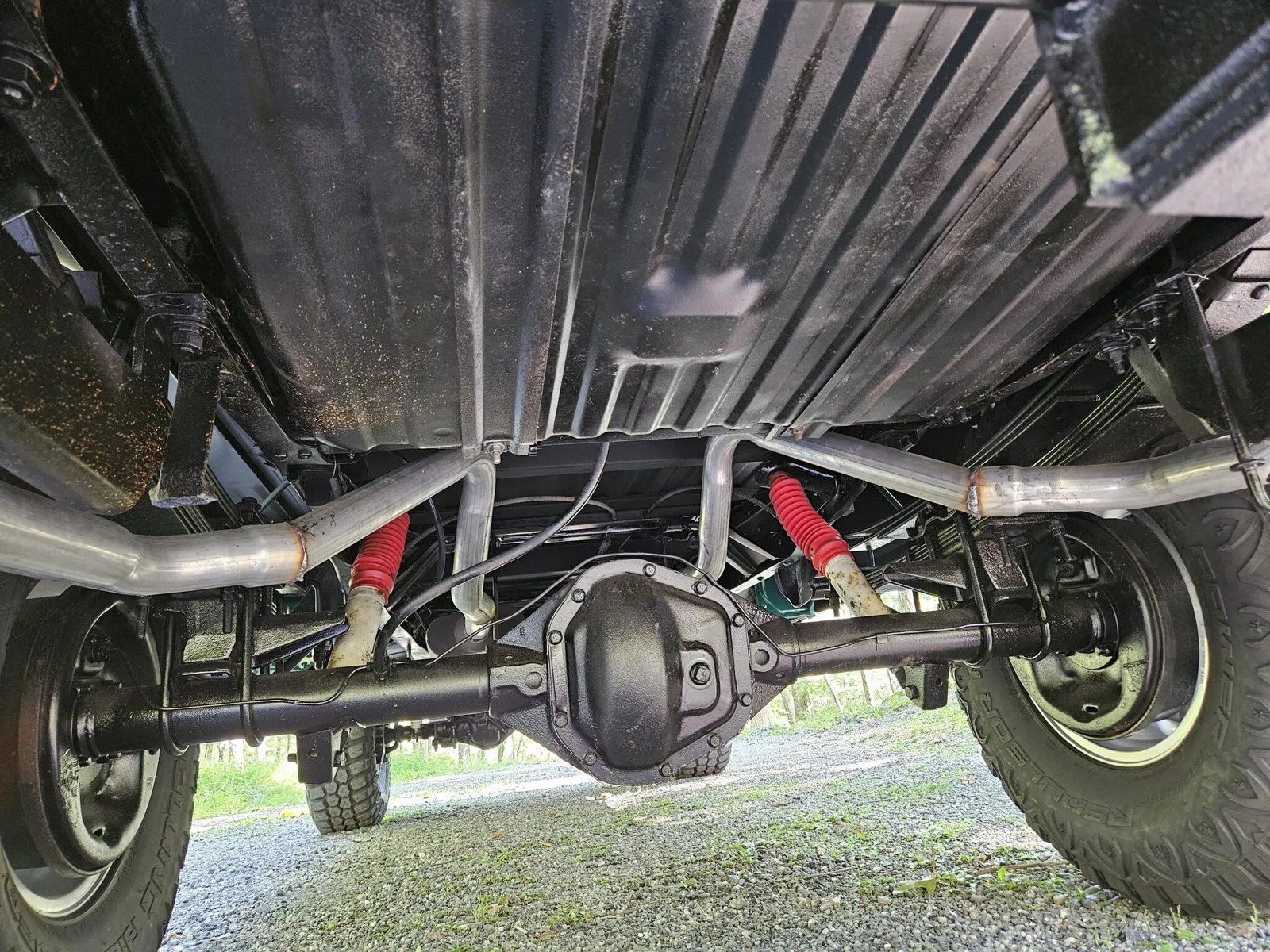 The 16″ steel wheels are mounted with 315/75 Rolling Big Power M/T tires. The truck is equipped with manually locking front hubs and power steering, and braking is provided by power-assisted front discs and rear drums.
