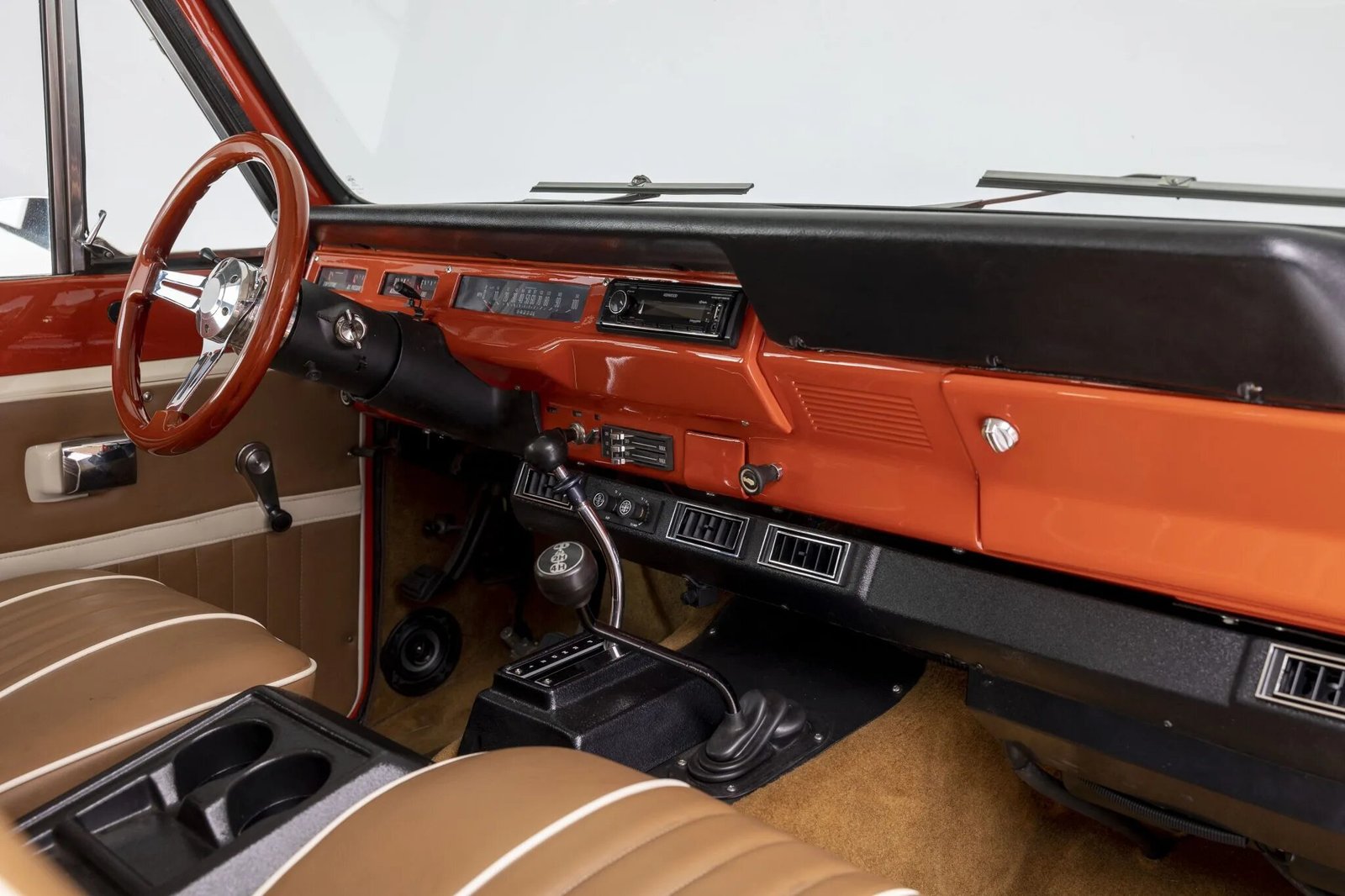 The cabin features front bucket seats and a rear bench re-trimmed in tan vinyl with white piping in addition to matching door panels and a body-color dashboard.