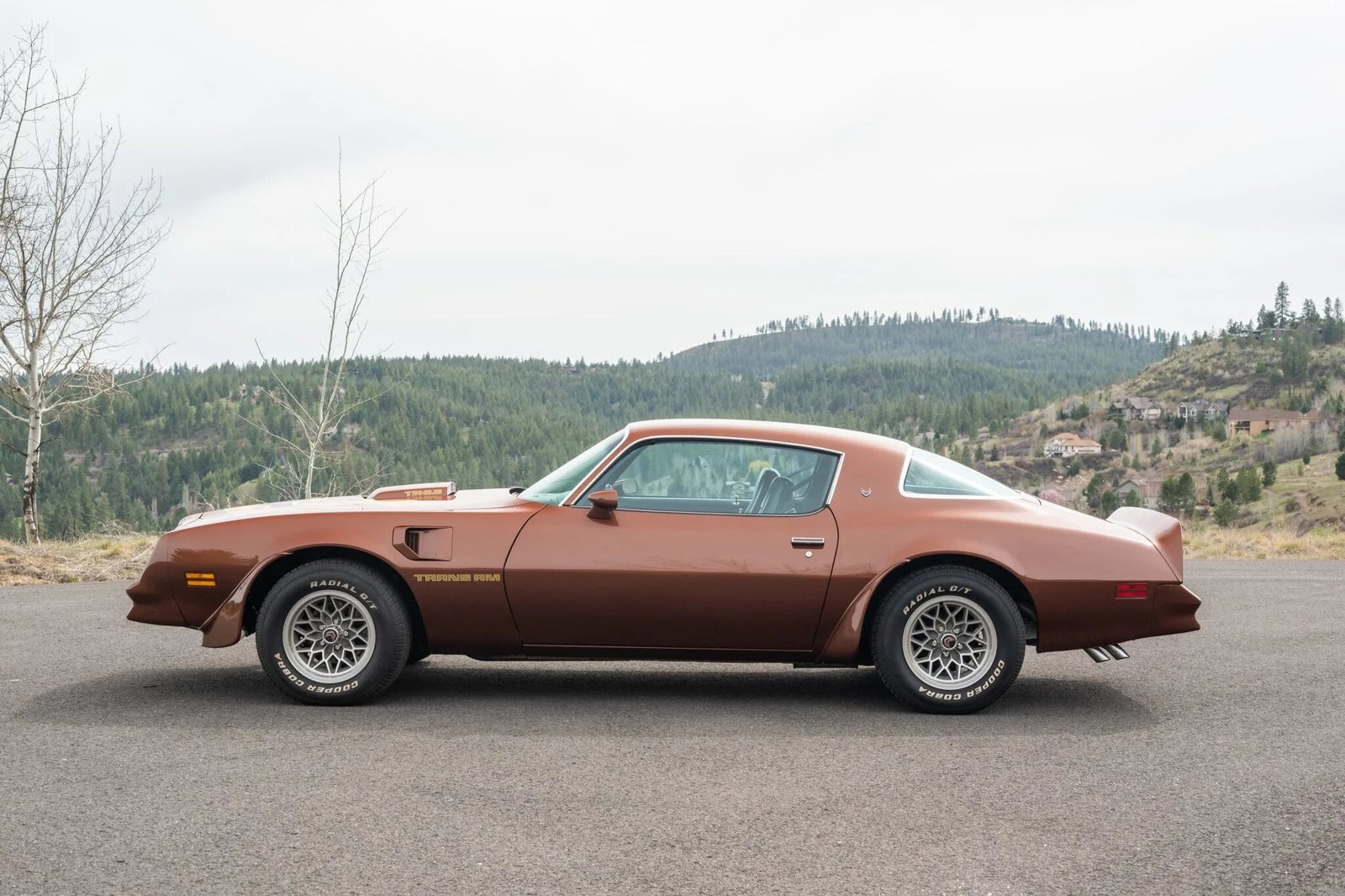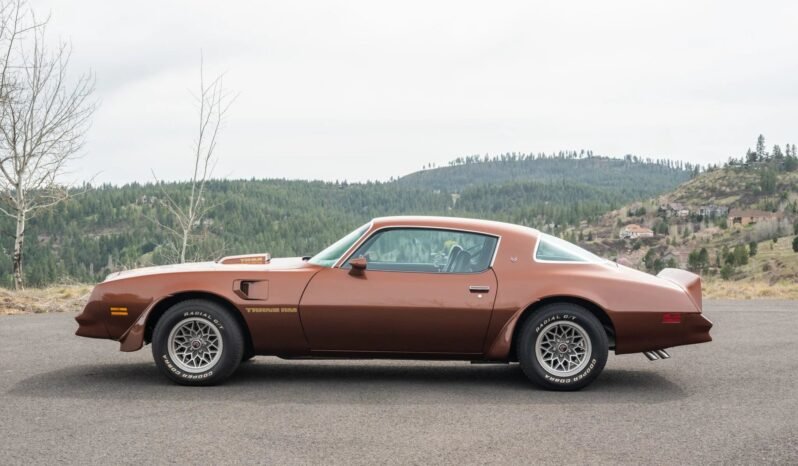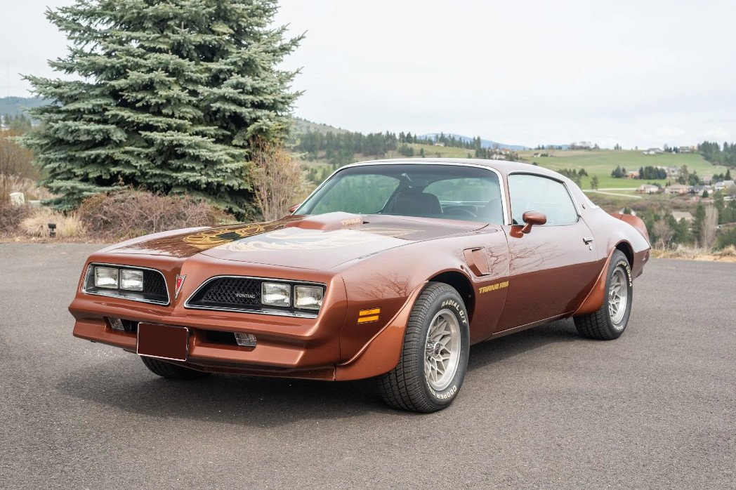 This 1978 Pontiac Firebird Trans Am was stored from 1987 until 2012. Subsequent refurbishment have involved a repaint, rebuilding the 400ci V8, an overhaul of the brakes, and replacement of the headliner, alternator, and radiator. The car is finished in Chesterfield Brown over a black interior and equipped with a four-speed manual transmission, a Positraction rear end with a 3.42:1 gear ratio, a shaker hood, 15” snowflake wheels, a Kenwood head unit with HD radio, and a Hurst T-handle shifter.