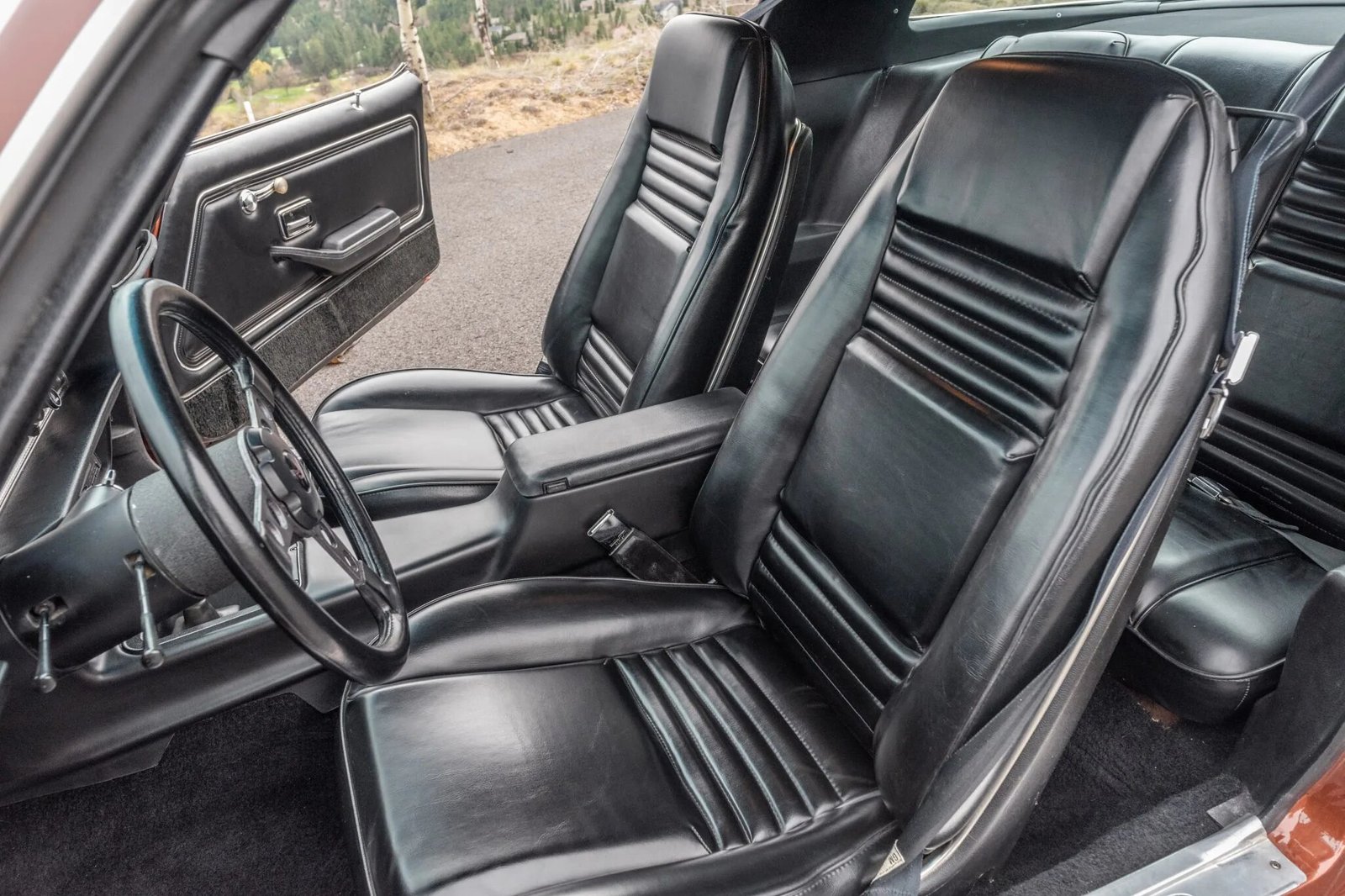 The cabin houses front bucket seats and a rear split bench trimmed in black vinyl along with matching door panels and carpeting.