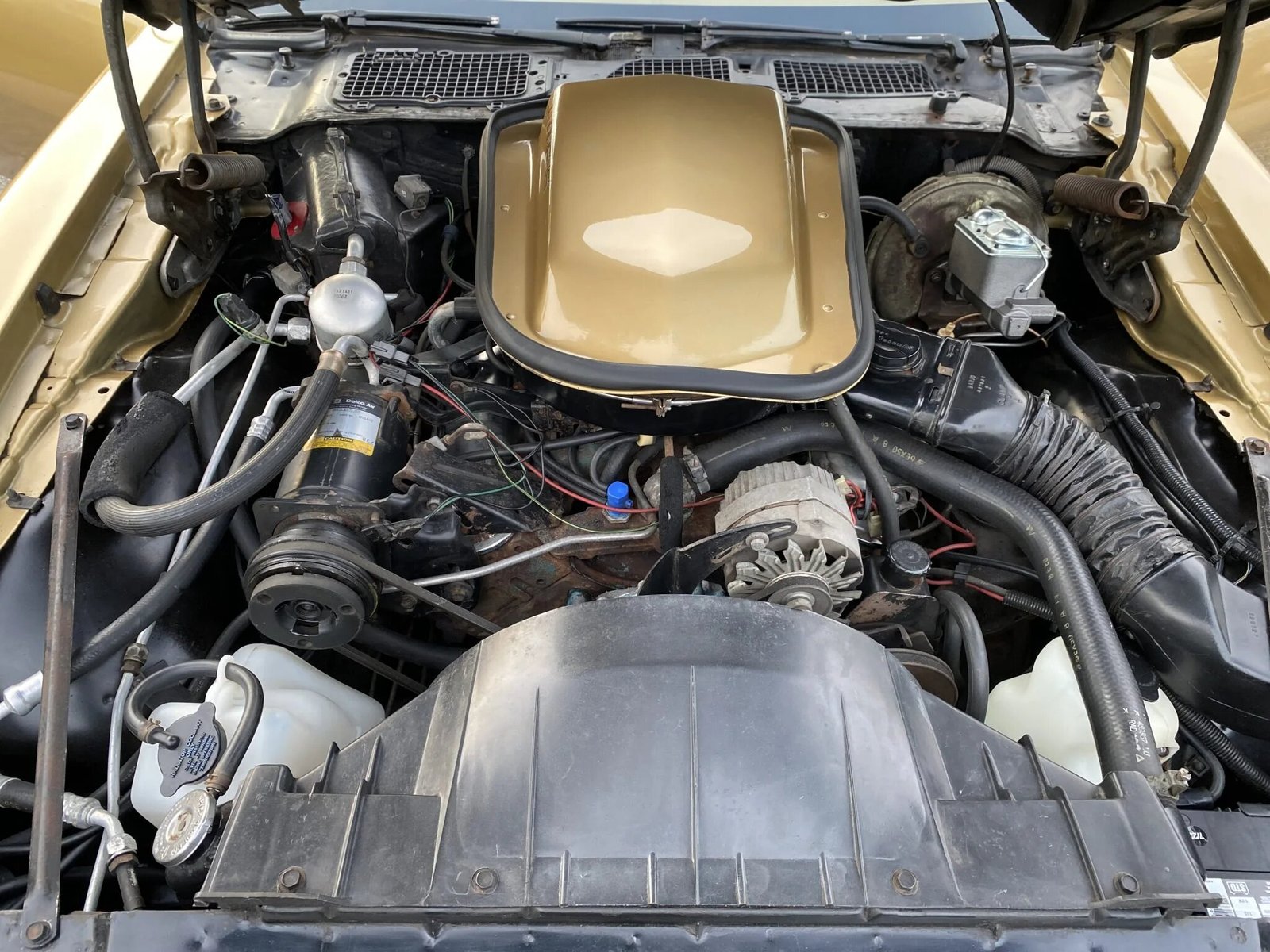 Additional equipment includes 15″ gold-finished snowflake wheels, front disc brakes, a rear spoiler, front fender vents, a shaker hood, air conditioning, and an aftermarket stereo head unit and speakers.