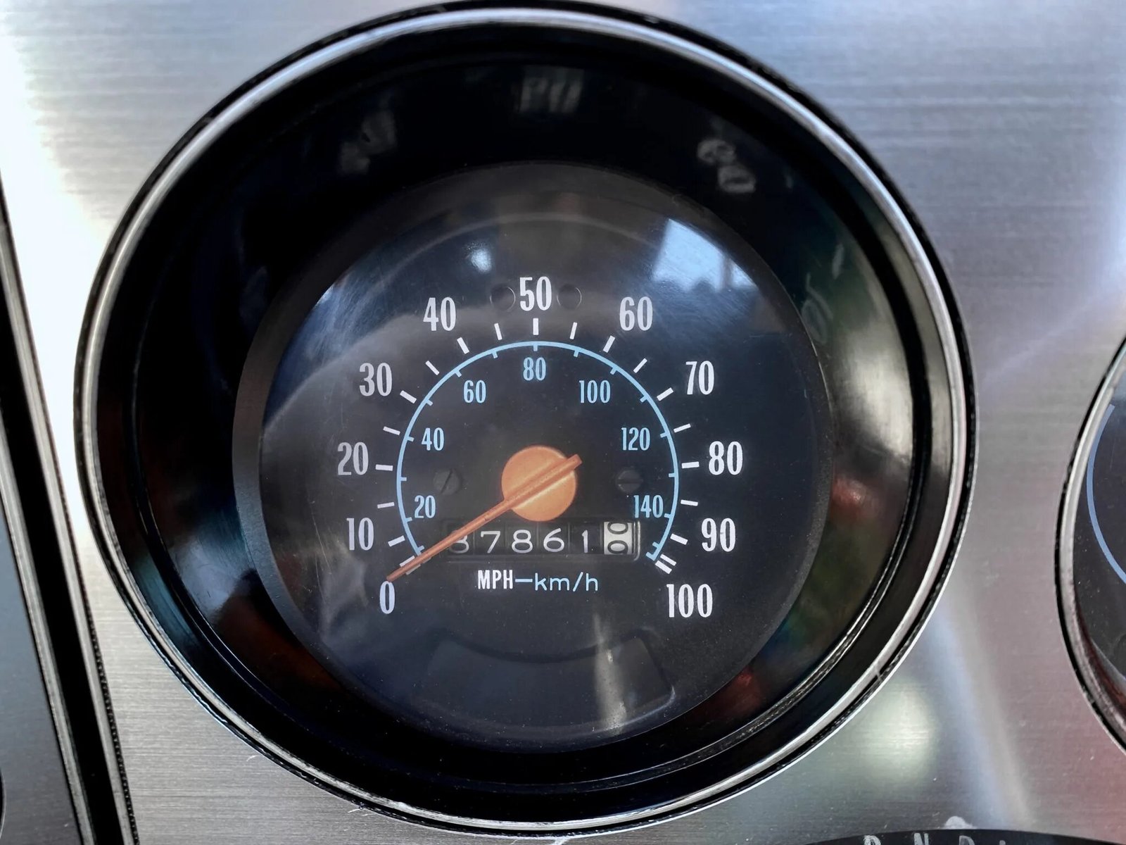 A replacement four-spoke steering wheel frames a 100-mph speedometer and a fuel level gauge.