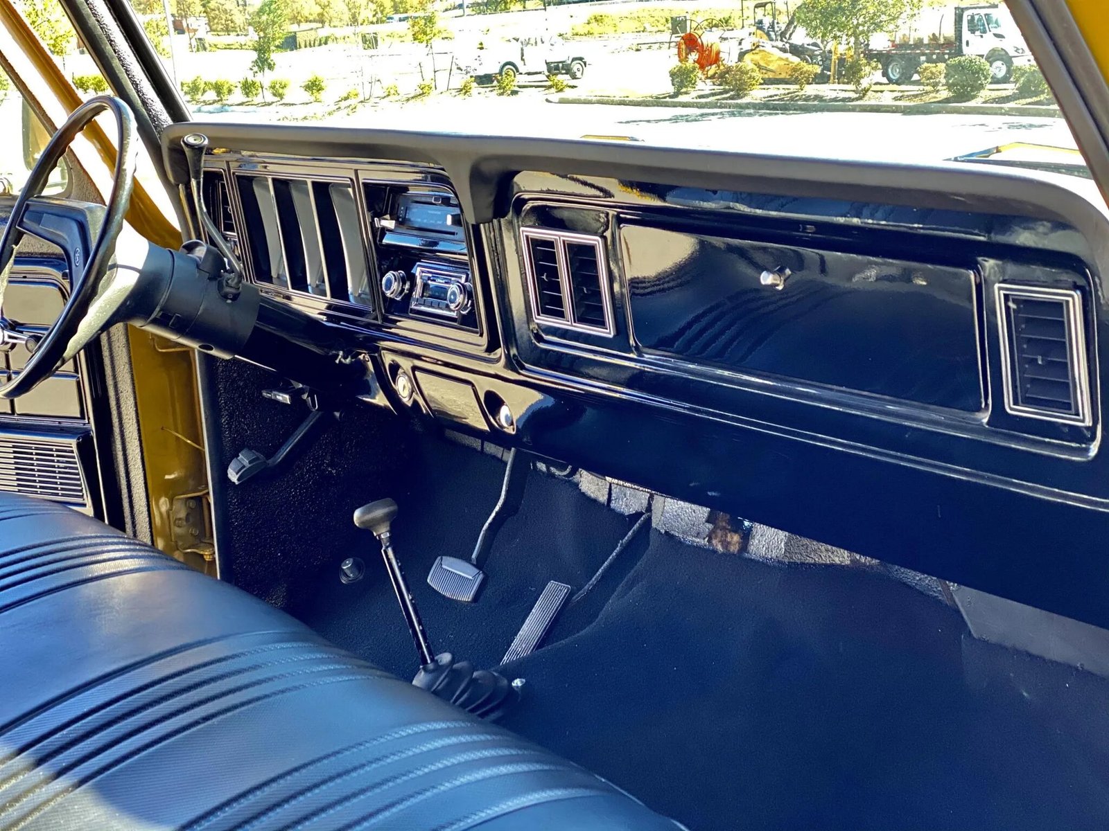 The interior features front and rear bench seats trimmed in replacement black vinyl, and the front seats are accented with gold Ford Bronco lettering on the seatbacks.