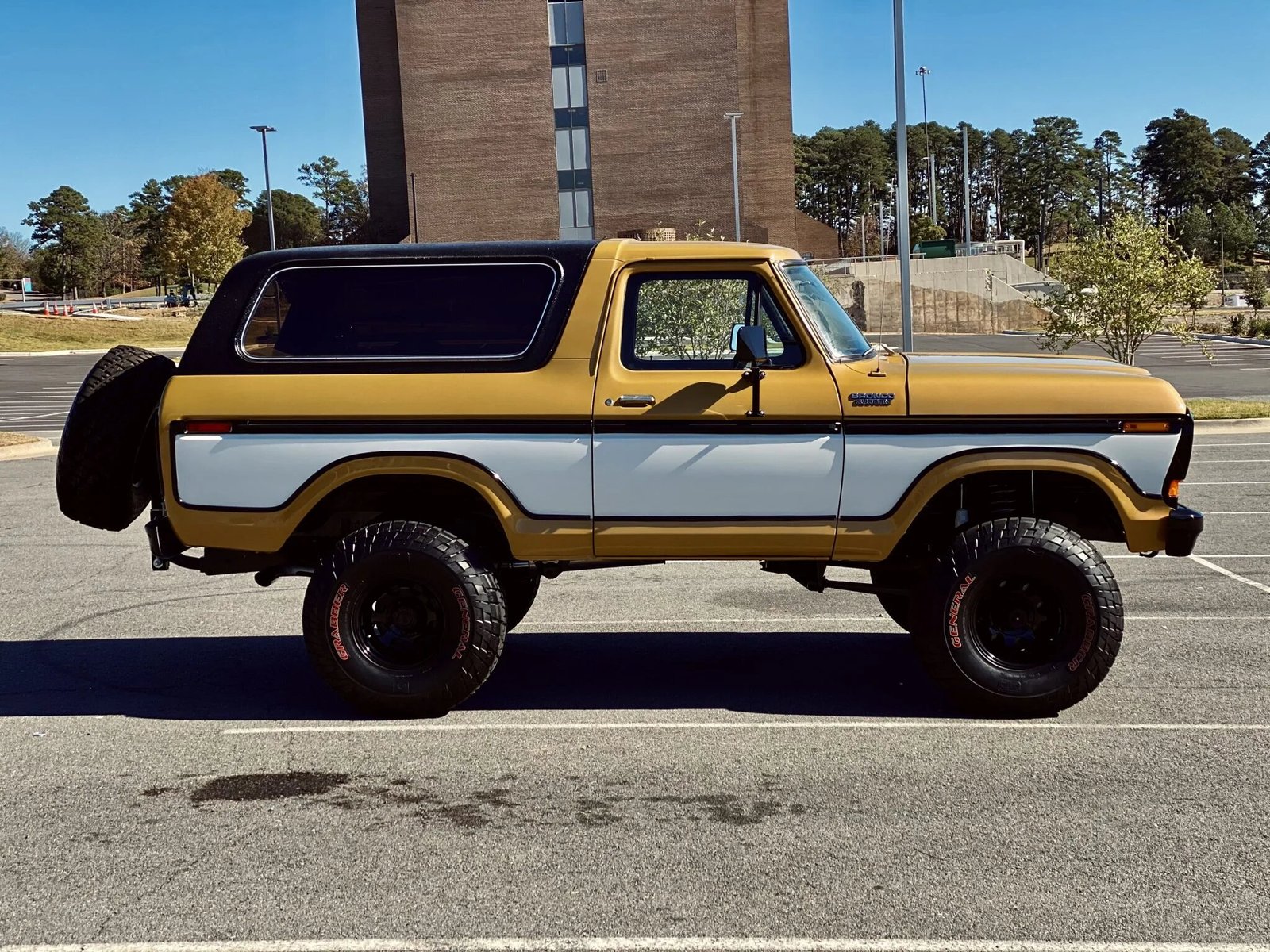 This 1979 Ford Bronco is finished in gold and white and powered by a 400ci V8 mated to a rebuilt three-speed automatic transmission and a dual-range transfer case.