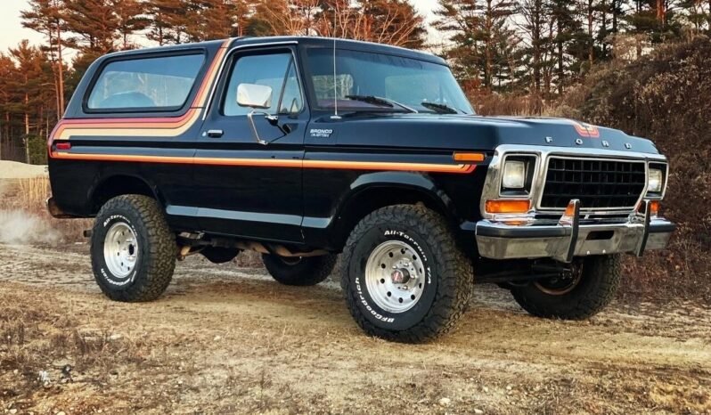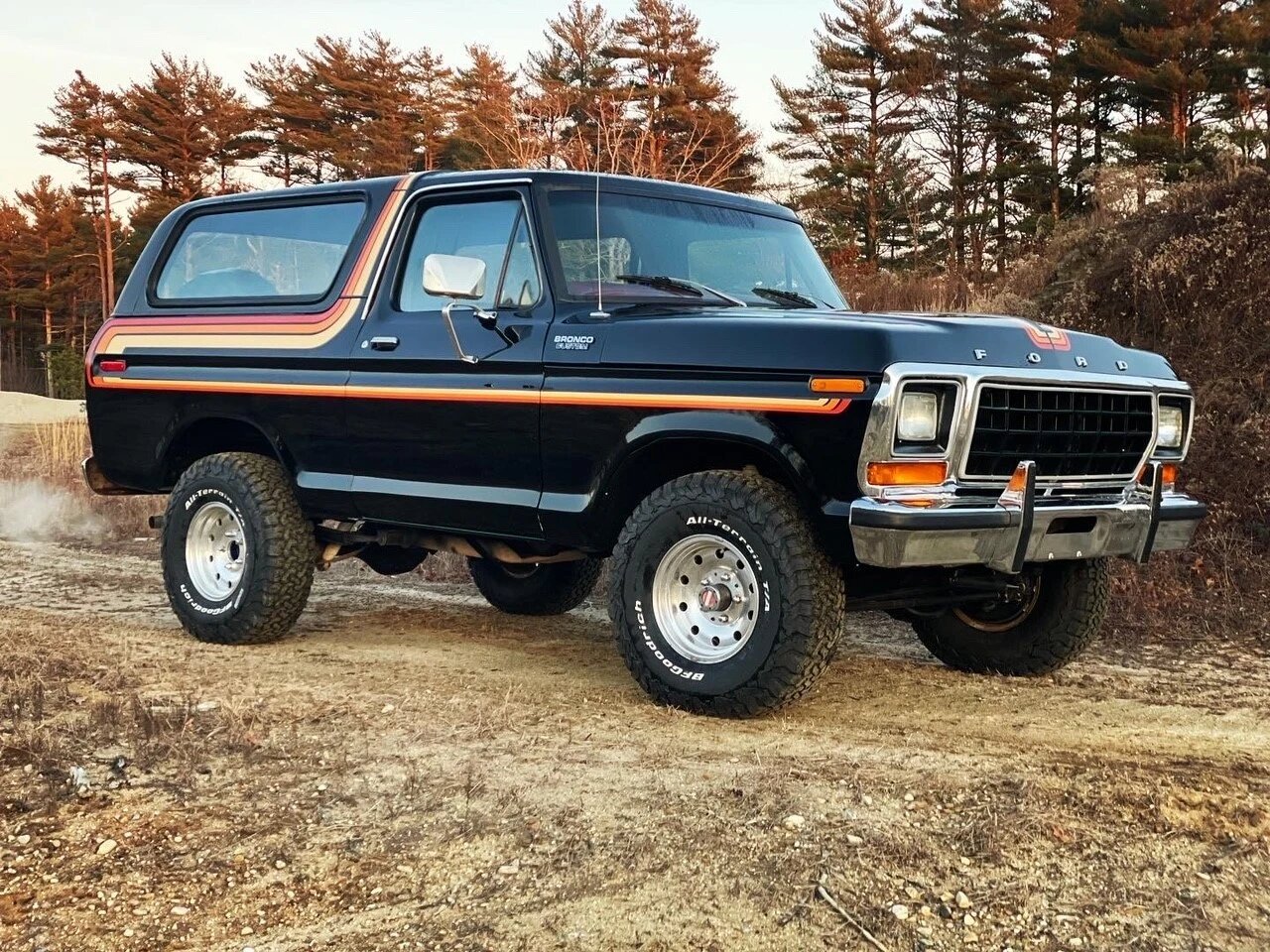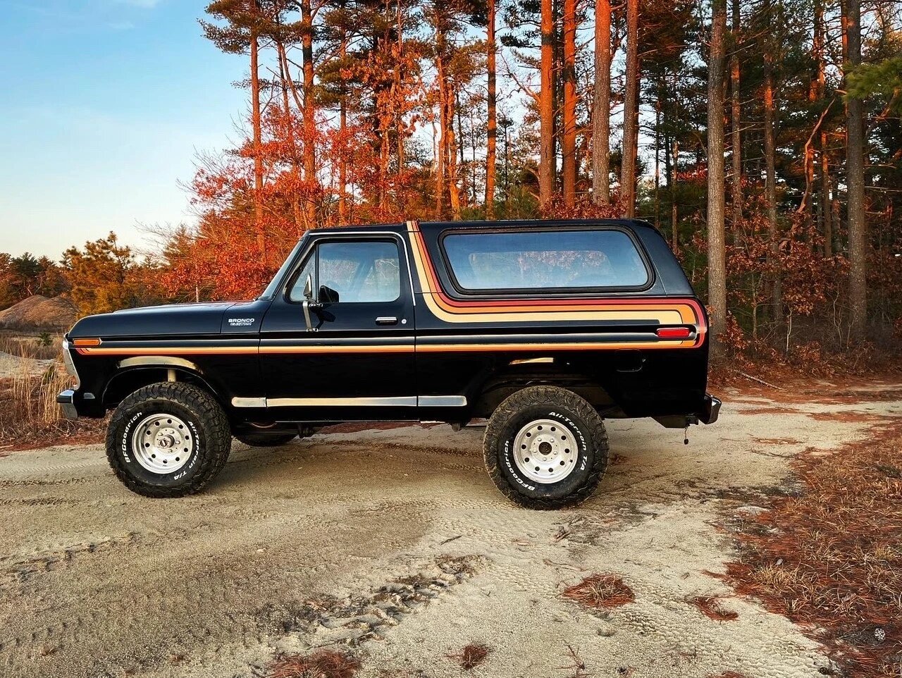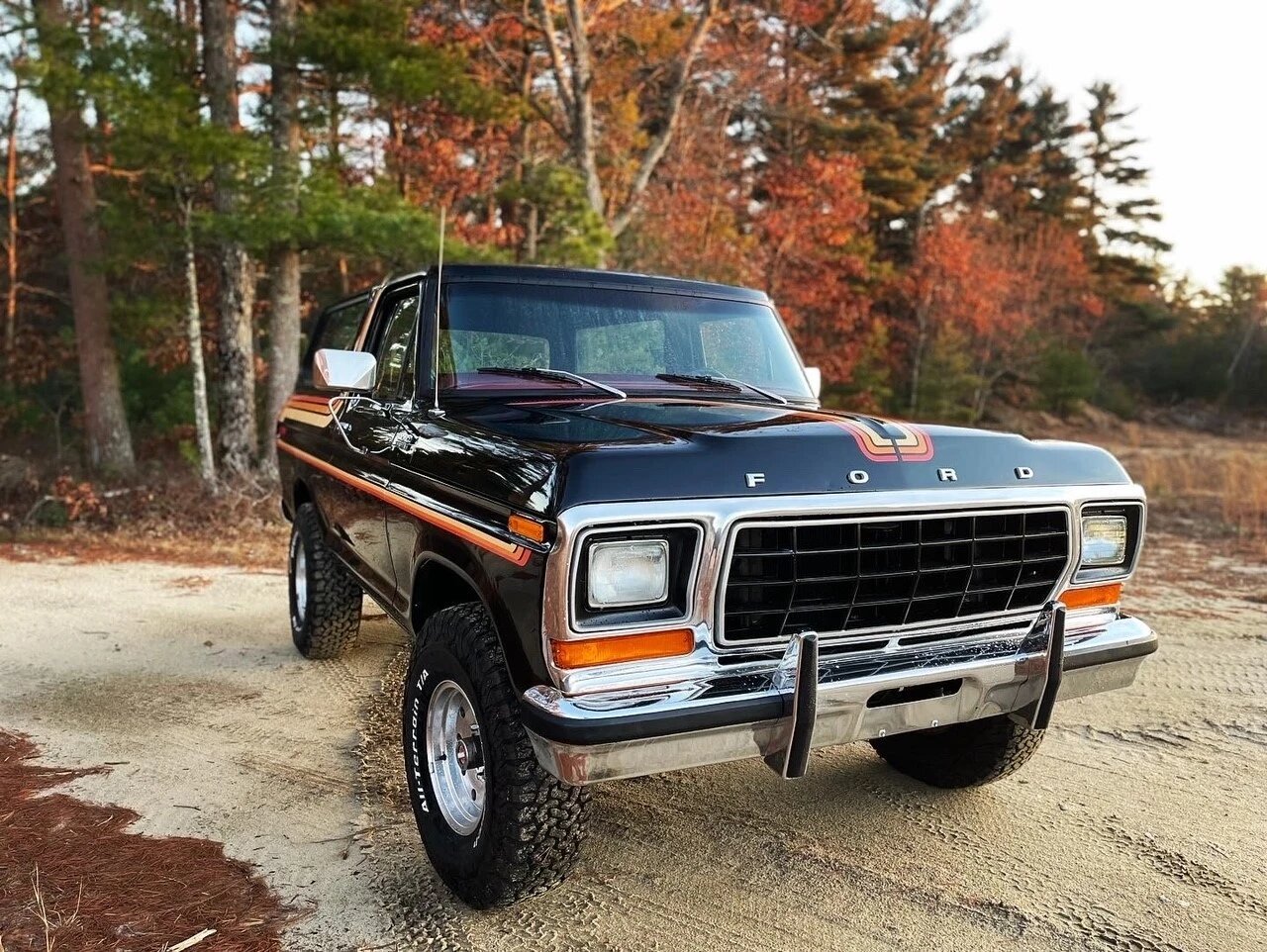 Finished in Raven Black over two-tone black and red upholstery, the truck is powered by a 351ci V8 mated to a four-speed manual transmission and a dual-range transfer case.