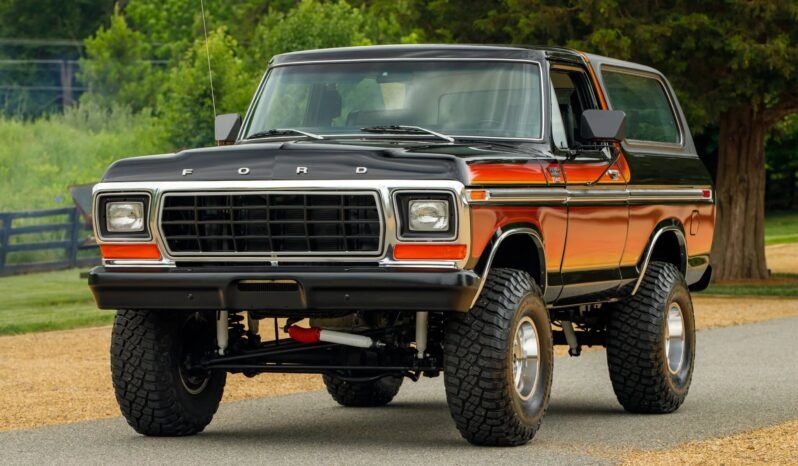 The truck is finished in Raven Black over black upholstery and is equipped with a fuel-injected 460ci V8 paired with a three-speed automatic transmission and a dual-range transfer case. The truck is equipped with Chromatic tape stripes, and modifications include a 4″ suspension lift, 15″ US Mags wheels, an aftermarket climate control system, and a RetroSound stereo system featuring Bluetooth connectivity.