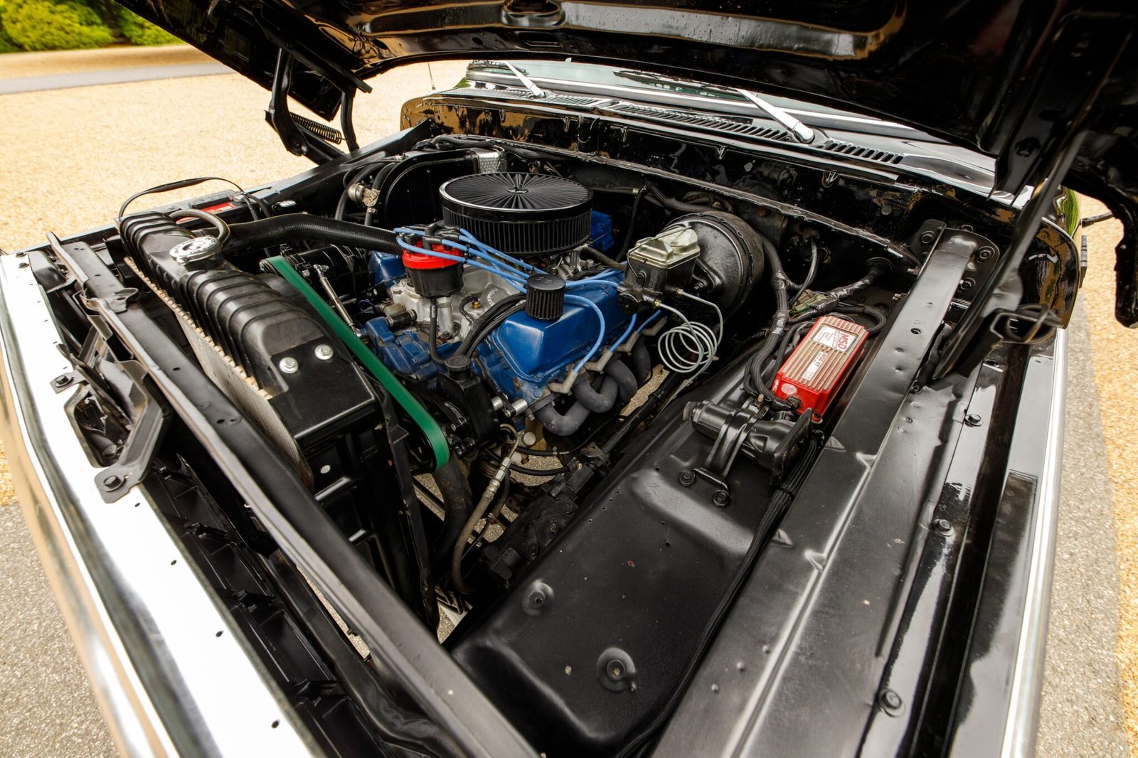 The replacement 460ci V8 is equipped with a Holley Sniper fuel-injection system, a CVF Racing serpentine accessory drive system, and tubular exhaust headers.