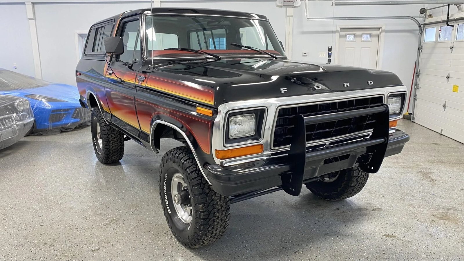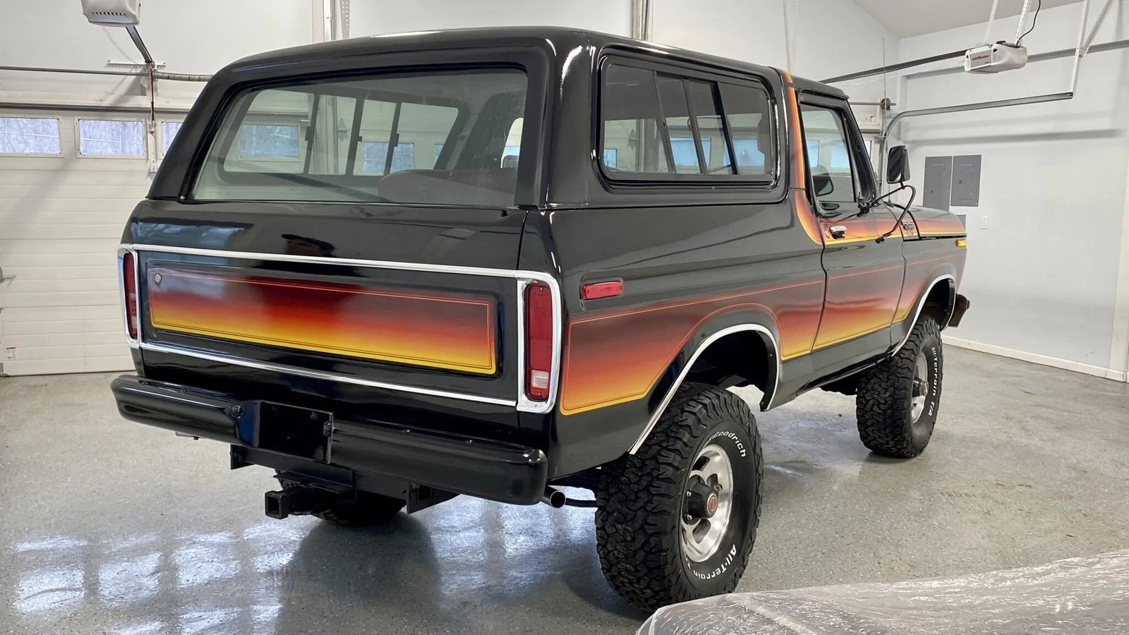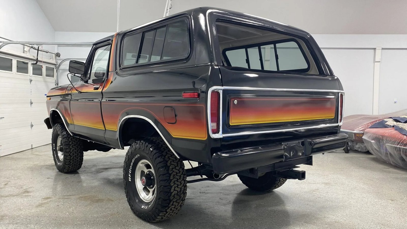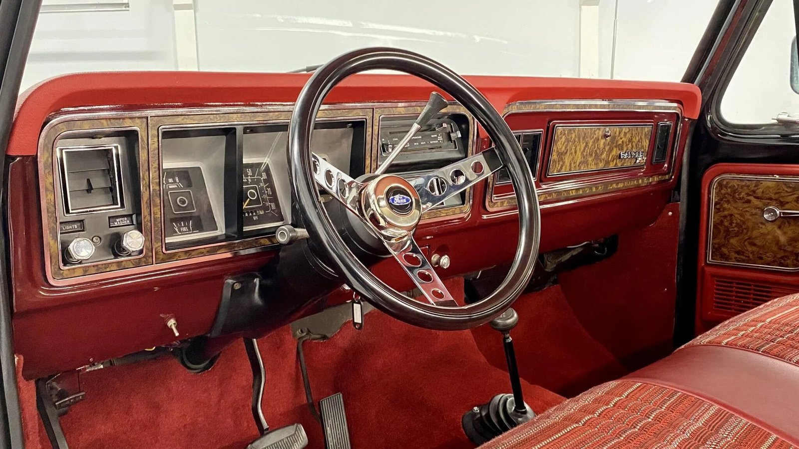 The truck is finished in black with chromatic tape stripes over a red cloth and vinyl interior and is powered by a 351ci V8 linked with a three-speed automatic transmission and a dual-range transfer case.