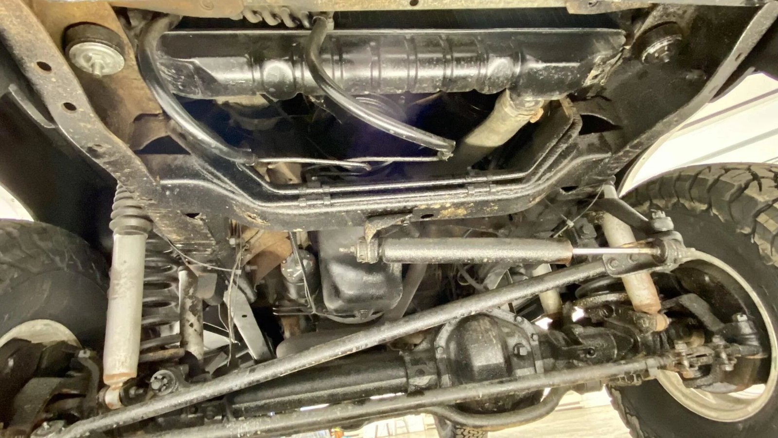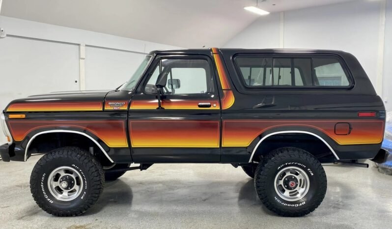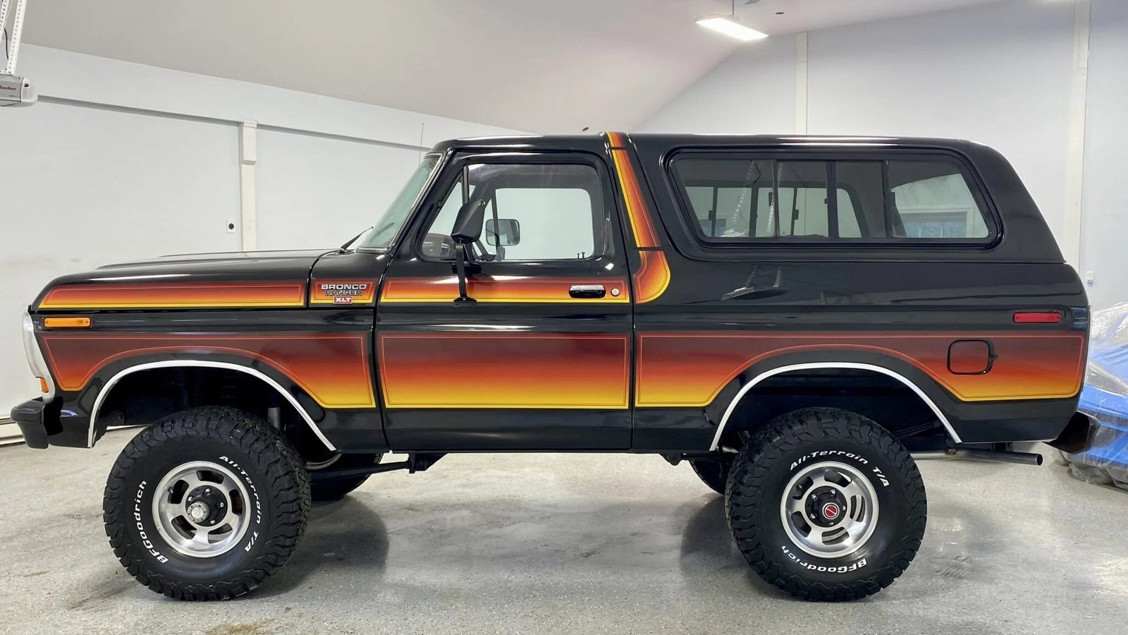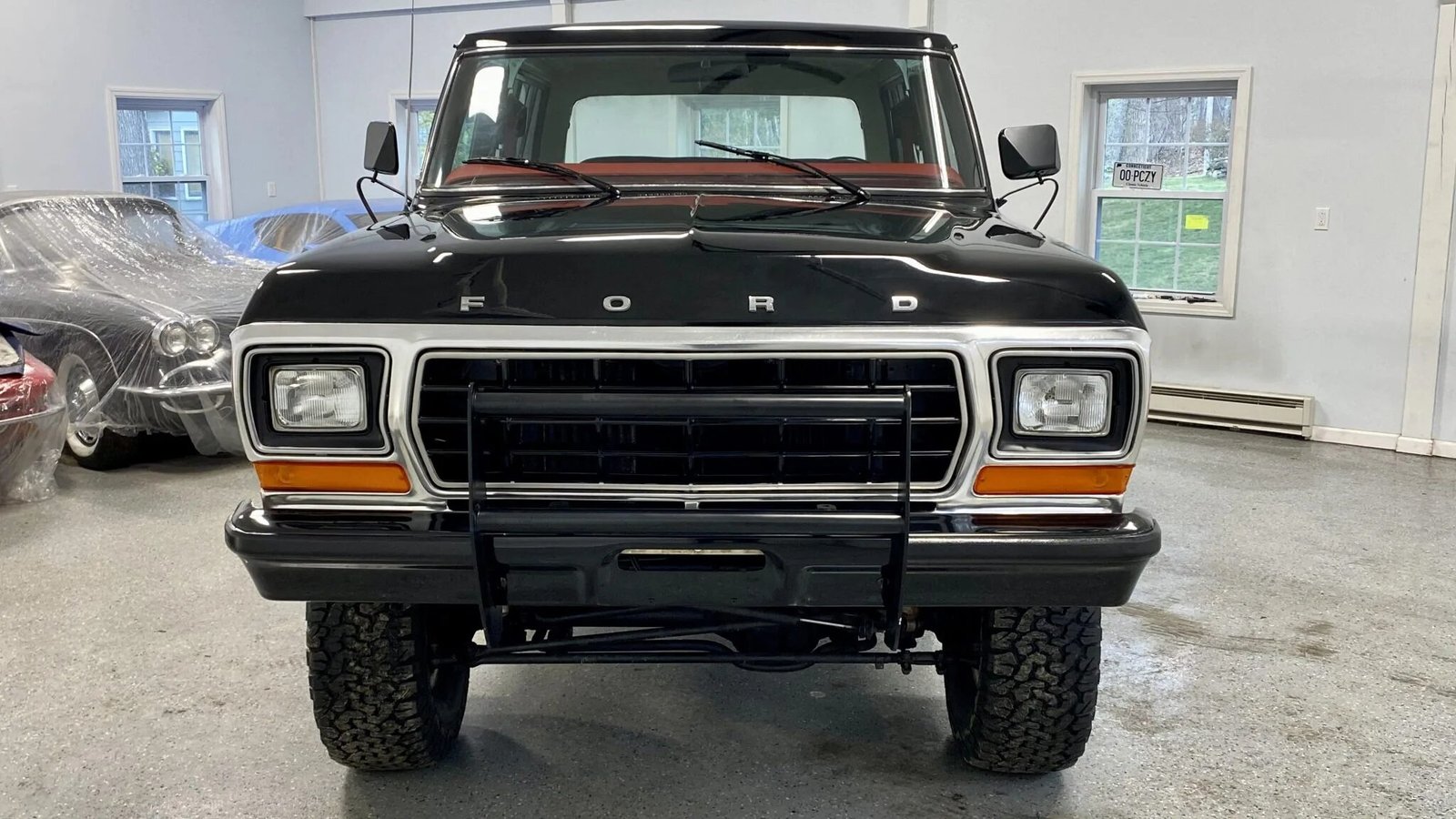 The truck is finished in black with chromatic tape stripes over a red cloth and vinyl interior and is powered by a 351ci V8 linked with a three-speed automatic transmission and a dual-range transfer case.