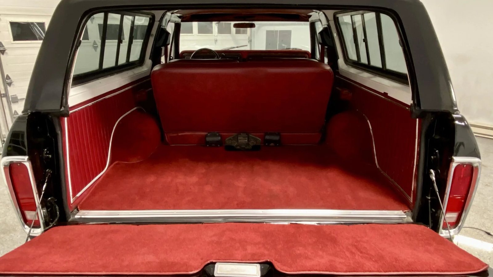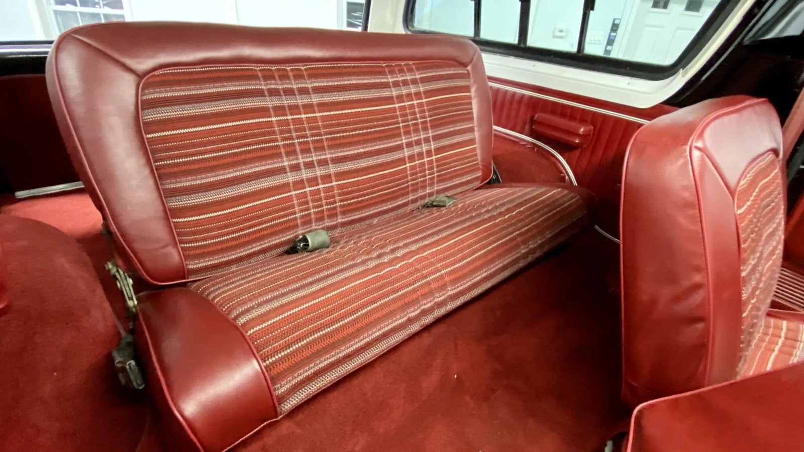 The cabin was refurbished with front and rear bench seats trimmed in red vinyl with patterned cloth inserts joined by a matching dash, door panels, and carpets.