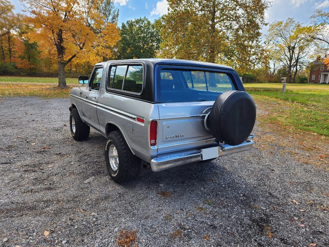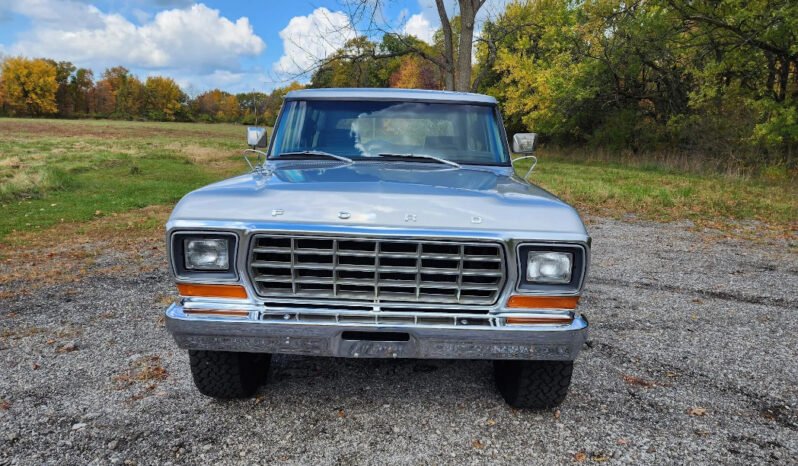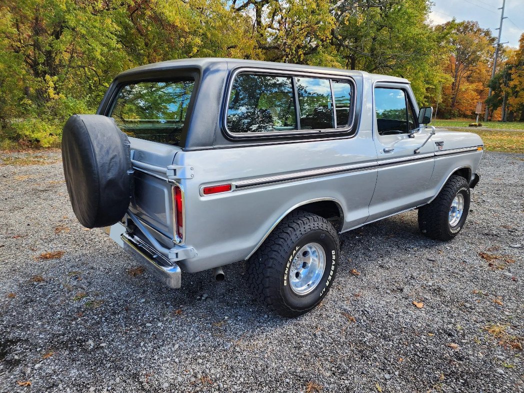 This 1979 Ford Bronco XLT is powered by a 400ci V8 mated to a four-speed automatic transmission and a dual-range transfer case and is finished in silver over black vinyl and gray cloth upholstery. Equipment includes a limited-slip rear differential, a removable hardtop, Pro Comp 15″ wheels, a dual exhaust system, an Edelbrock carburetor, a Panasonic CD stereo, front bucket seats, and a center console.