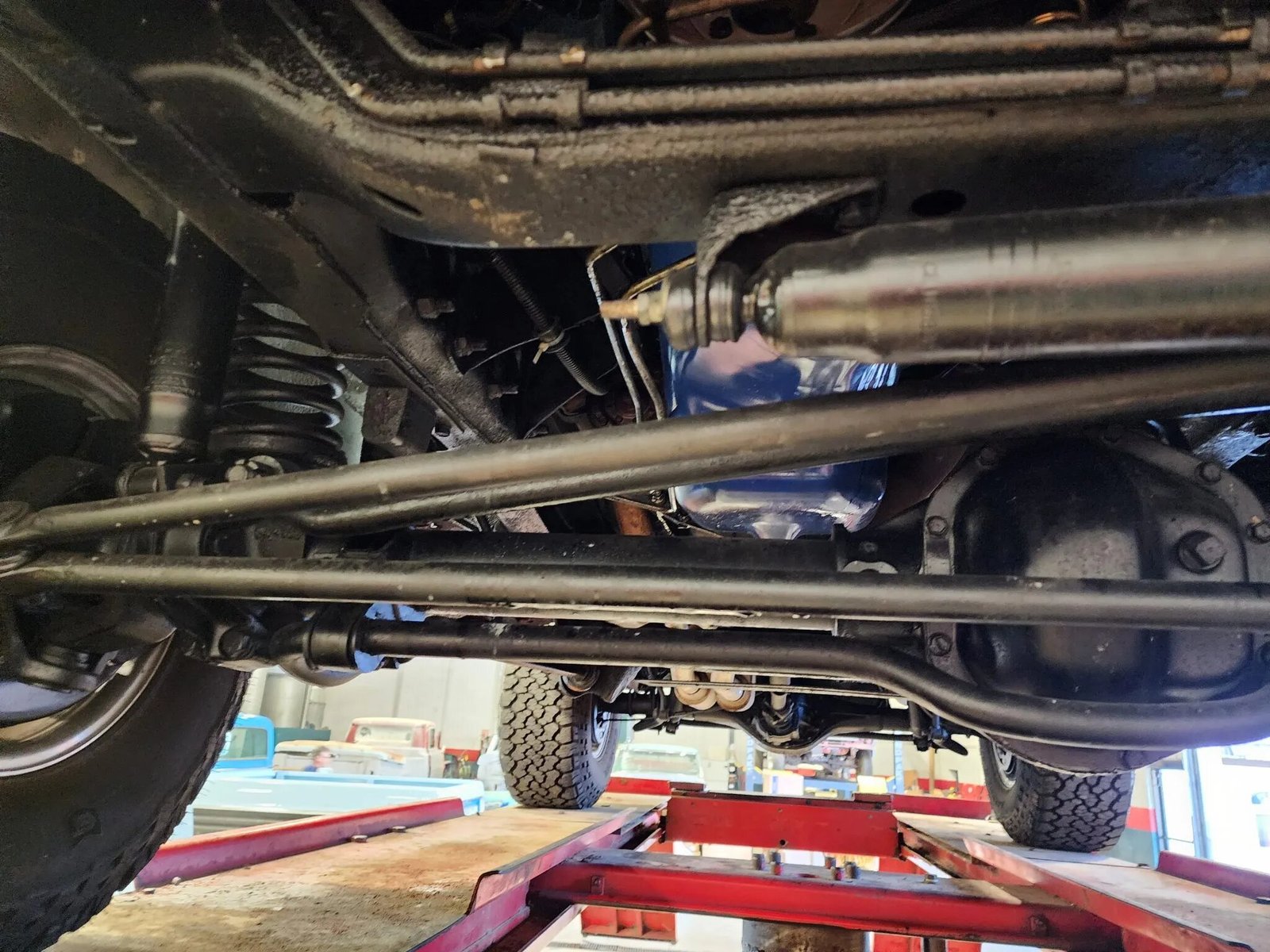 Polished 15″ Pro Comp alloy wheels are wrapped in 33×12.5″ General Grabber A/T tires. Braking is handled by power-assisted four wheel drums and the truck is equipped with power steering along with locking front hubs. Some of the brake lines have been replaced and the system bled.