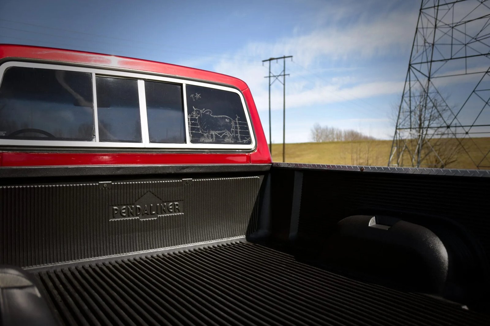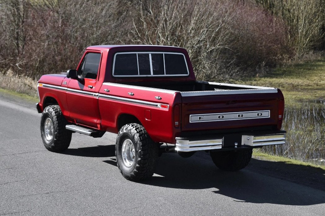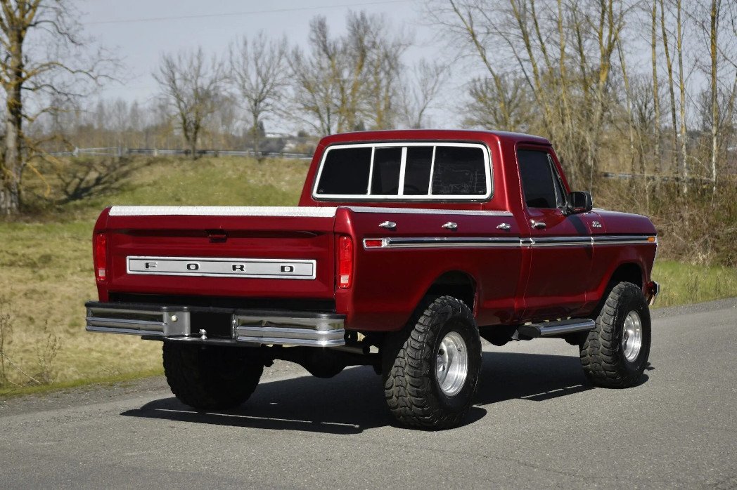 This 1979 Ford F-150 Custom 4x4 is finished in dark red over black and is powered by a replacement 360ci V8 paired with a four-speed manual transmission and a dual-range transfer case.