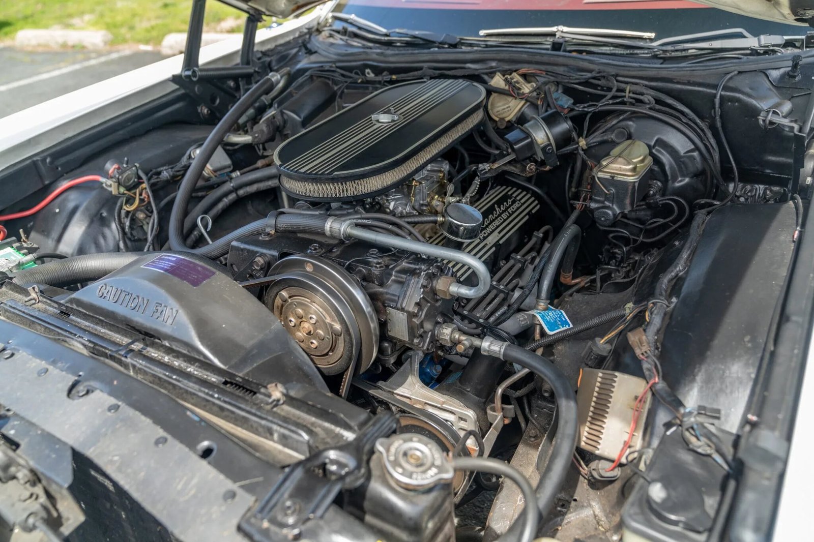 The 302ci V8 was said to be rebuilt with an aftermarket camshaft and Keith Black pistons, and features an aftermarket Edelbrock carburetor, an MSD ignition coil, finned aluminum valve covers, and an open-element air cleaner.