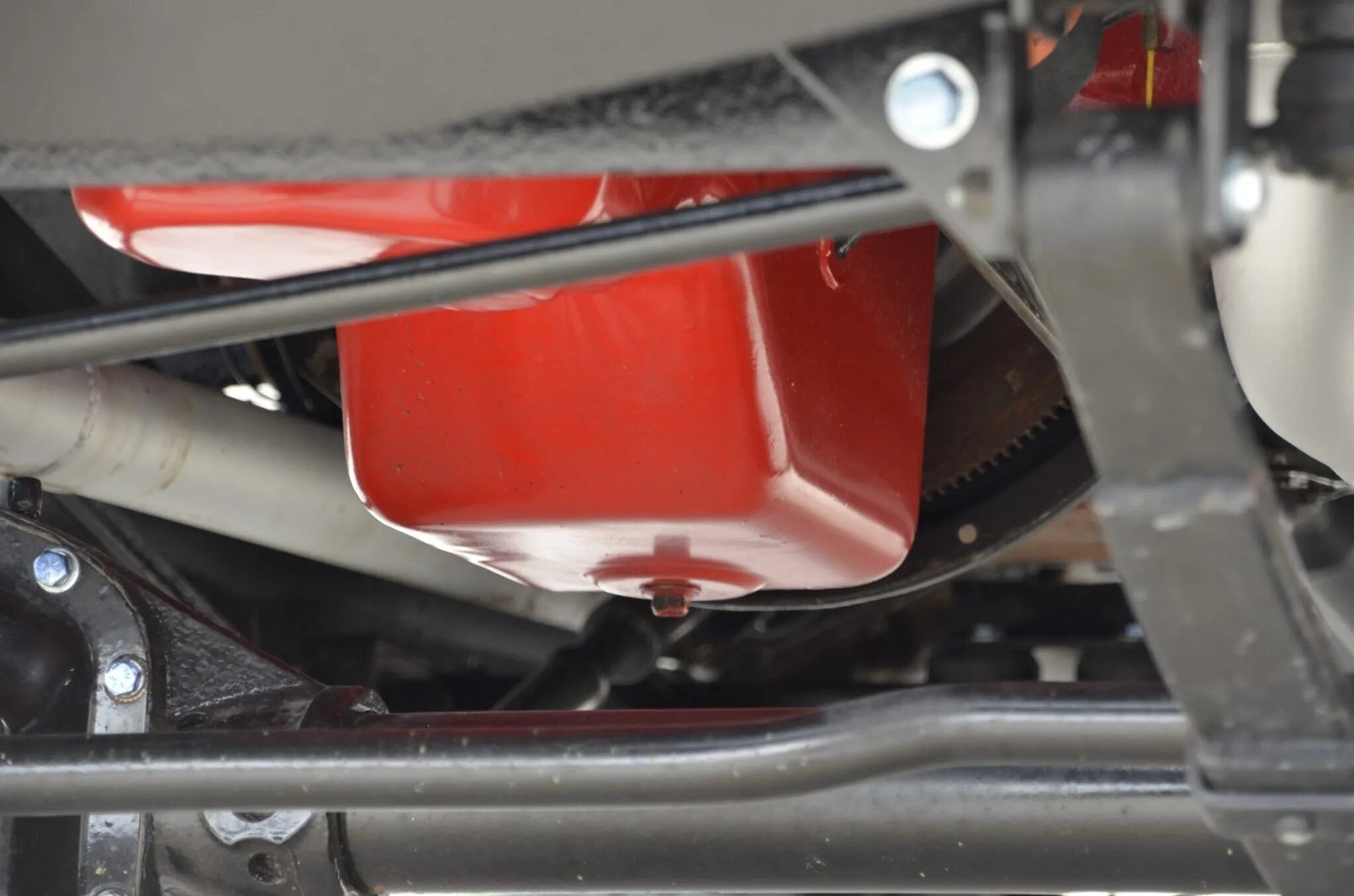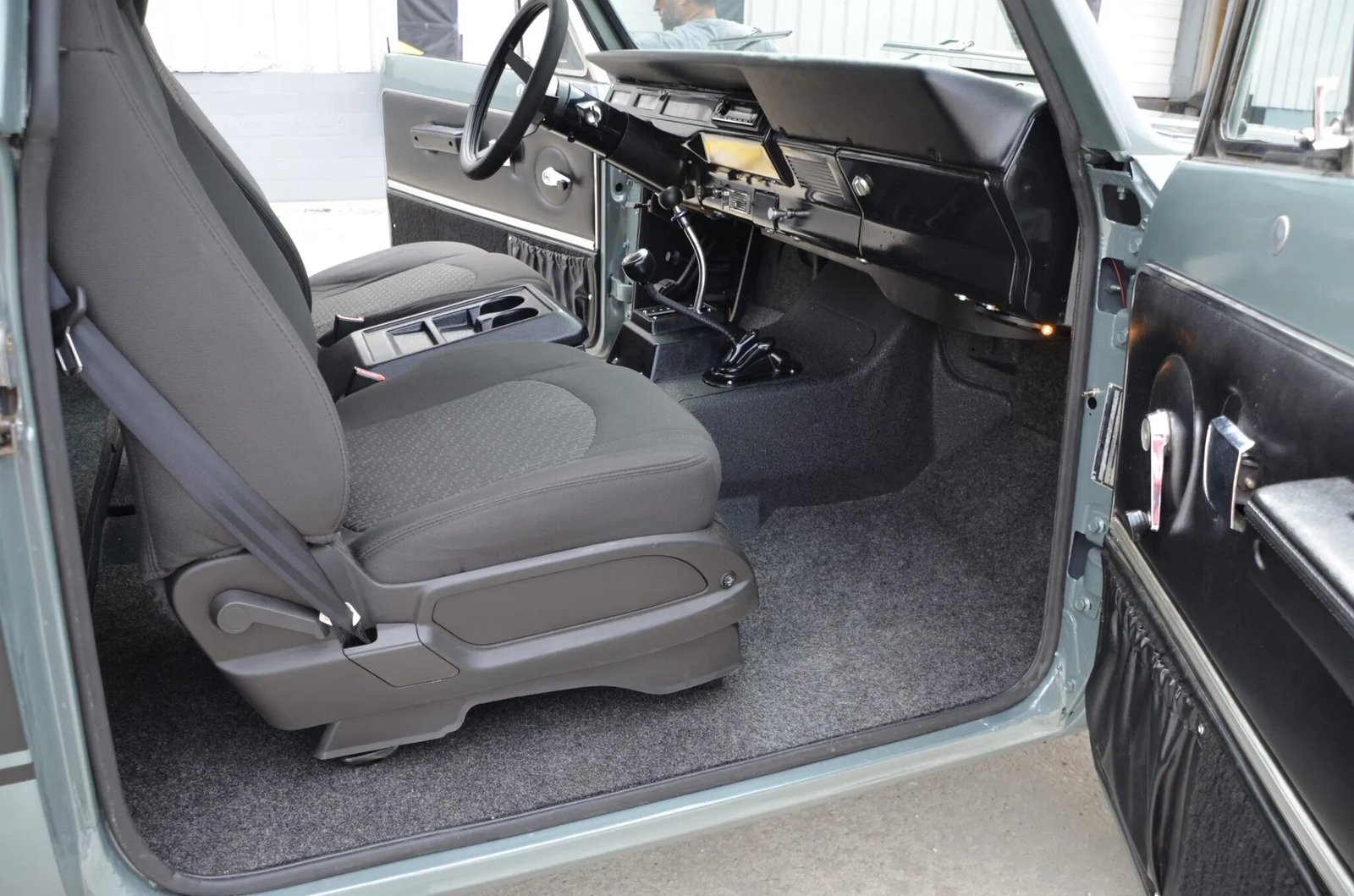 The cabin is equipped with later model seating that includes front bucket seats and a rear bench trimmed in black cloth. The floors have been finished in a black textured coating, and appointments include gray carpets, heated front seats, a power-adjustable driver’s seat, three-point front seat belts, hand-crank side windows, a locking glove compartment, a center storage armrest, and a Kenwood head unit.