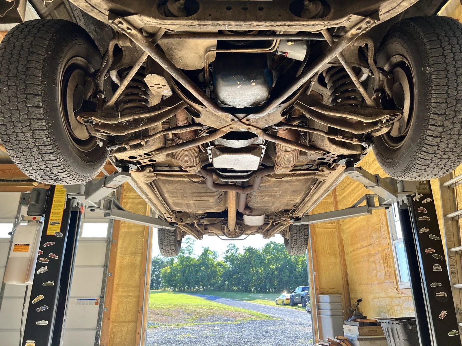 Forged-aluminum 15″ wheels are mounted with 225/75 Bridgestone SF-402 whitewall tires.