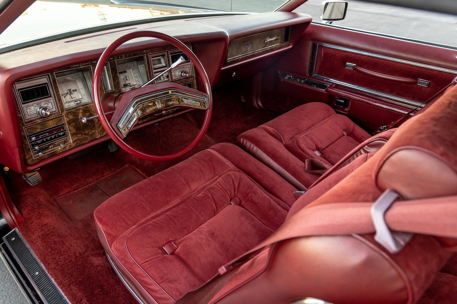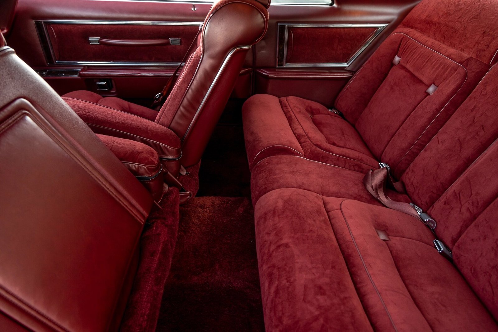 Power is provided by a 400ci V8 paired with a three-speed automatic transmission, and the car is finished in black with a matching Landau vinyl roof over red velour upholstery.
